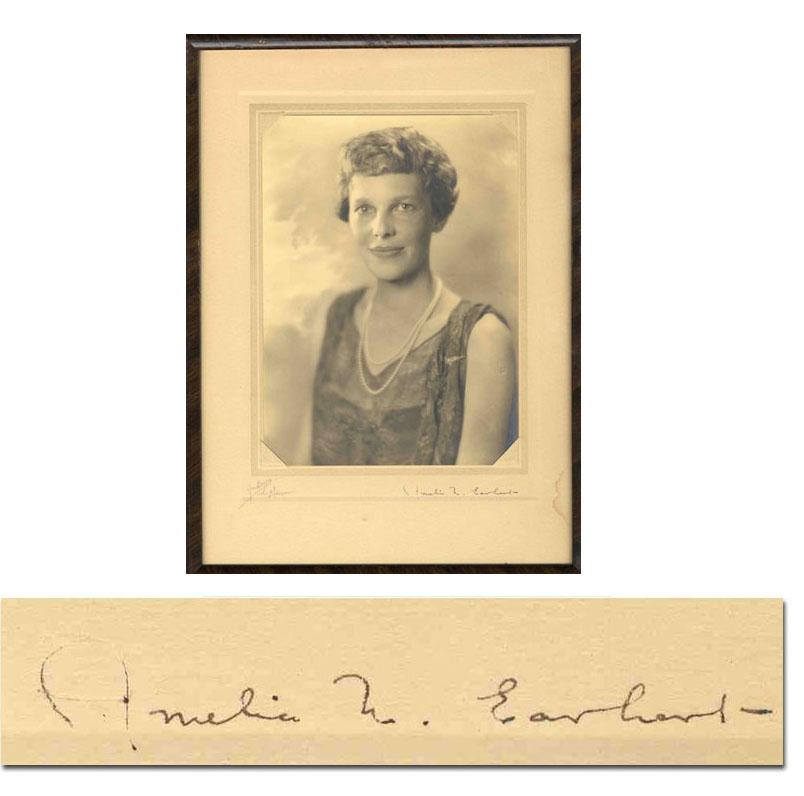 Portrait-style photo of Amelia Earhart. Bold ink signature appears on white mat beneath image. On 17 July 1928, Earhart, accompanied by co-pilots Stulz and Gordon, became the first woman to fly cross the Atlantic. Frame measures 11'' x 15''; photo measures 7'' x 9.5''. Slight chipping to frame. Very good condition.