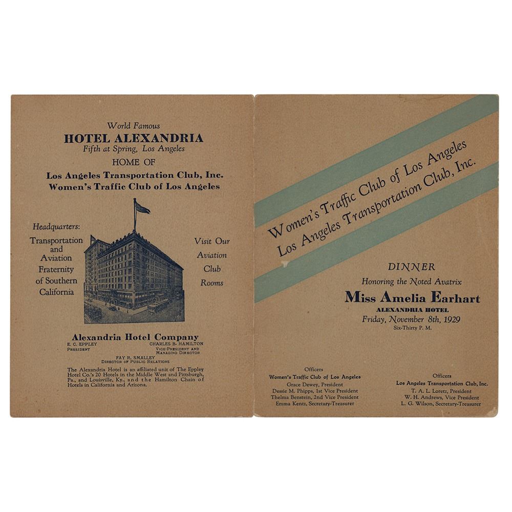Program for a dinner organized by the Women's Traffic Club of Los Angeles in honor of Amelia Earhart, held at the Alexandria Hotel on November 8, 1929, 5.5 x 7.25, signed inside in fountain pen, "Amelia Earhart, T.A.T." The opposite side bears a notary stamp and signature, and handwritten notations stating that the program was signed on the date of the dinner. In very good to fine condition, with flecks of surface loss to the front cover, and splitting to the ends of the hinge, partially repaired with old tape at the bottom.