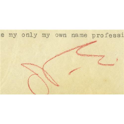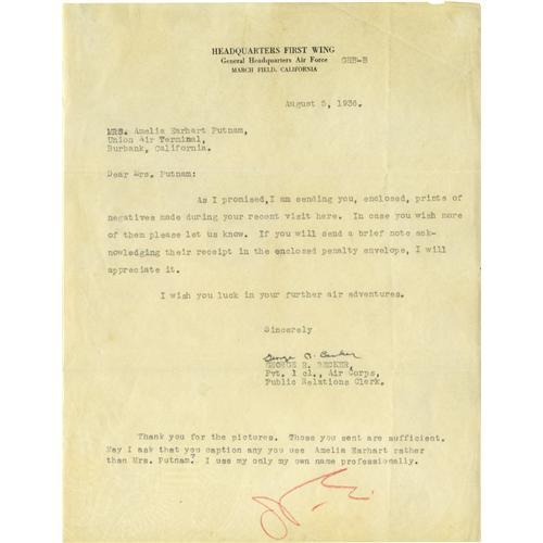 <B>Amelia Earhart Typed Letter Signed "<I>A.E.</B></I>"</B></I> One page, 8" x 10.25" typed letter on Air Force, Headquarters First Wing letterhead. Earhart's reply on August 5, 1936 consists of a few lines thanking a George Becker for some publicity photos. She also asks that he not use the name Mrs. Putnam in any of the captions, but instead to use Amelia Earhart. The letter is in fine condition with only a few areas of light soiling, and some deep fold lines.<BR><BR><b>Shipping:</b> Flat Material, Small (<a target="_blank" href="http://www.heritageauctions.com/common/shipping.php">view shipping information</a>)