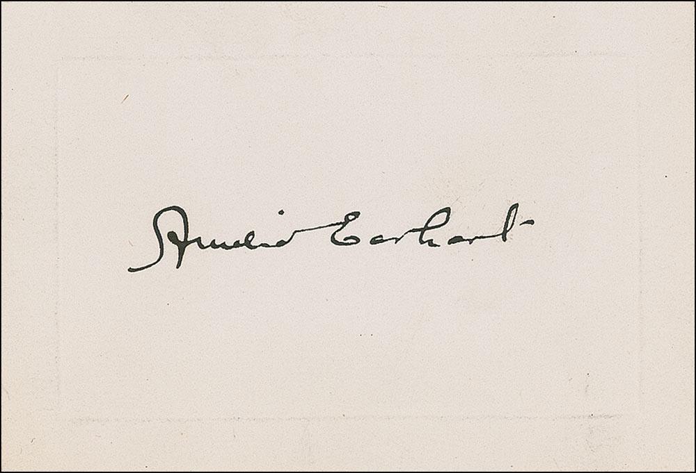 Fantastic fountain pen signature, “Amelia Earhart,” on an off-white 3 x 2 card. In fine condition.