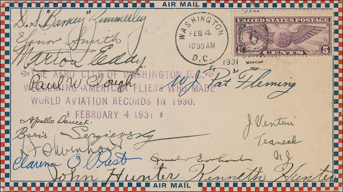 Red, white, and blue bordered air mail envelope, hand-stamped “The Aero Club of Washington, D. C., Welcoming American Fliers Who Made World Aviation Records in 1930, February, 4, 1931,” signed in ink by twelve aviators including Amelia Earhart, Elinor Smith, Marion Eddy, Apollo Soucek, L. F. ‘Lee’ Zimmerly, Clarence O. Post, Paul W. Clough, and Boris Sergievsky. Envelope is also addressed in an unknown hand to “J. Venturi, Teaneck, N.J.,” and bears Washignton, D.C. and Teaneck, N.J. postmarks. In fine condition, with a uniform shade of toning, and a bit of scattered light soiling. Accompanied by a two page description of each flier’s accomplishments in 1930. A possibly one-of-a-kind assemblage of early aviation pioneers.