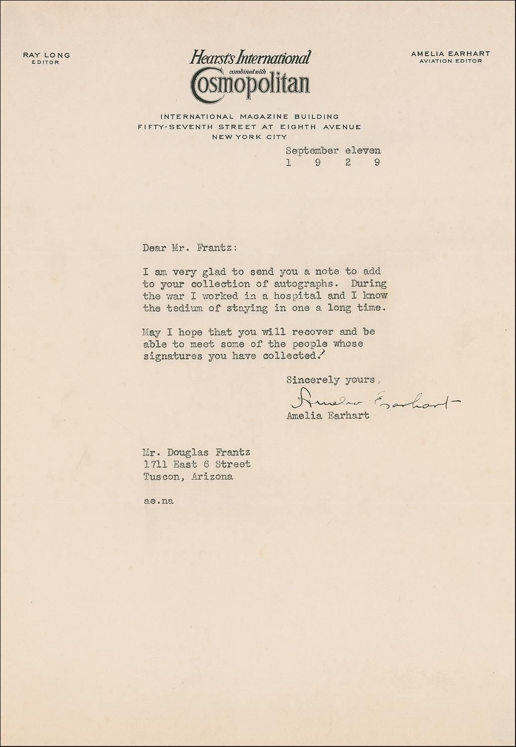 TLS, one page, 7.25 x 10.5, Hearst’s International combined with Cosmopolitan letterhead, September 11, 1929. Letter to a collector who is recovering from an illness. In full: “I am very glad to send you a note to add to your collection of autographs. During the war I worked in a hospital and I know the tedium of staying in one a long time. May I hope that you will recover and be able to meet some of the people whose signatures you have collected?” In fine condition, with some light edge toning, and a few strokes of signature light, but legible, due to irregular ink flow. Earhart served as a Voluntary Aid Detachment nurse at a military hospital until the Armistice in November 1918. It was there that she saw the result of four years' of war: men without arms and legs, men who were paralyzed or blind, and her compassion for hospitalized victims is clearly conveyed here.