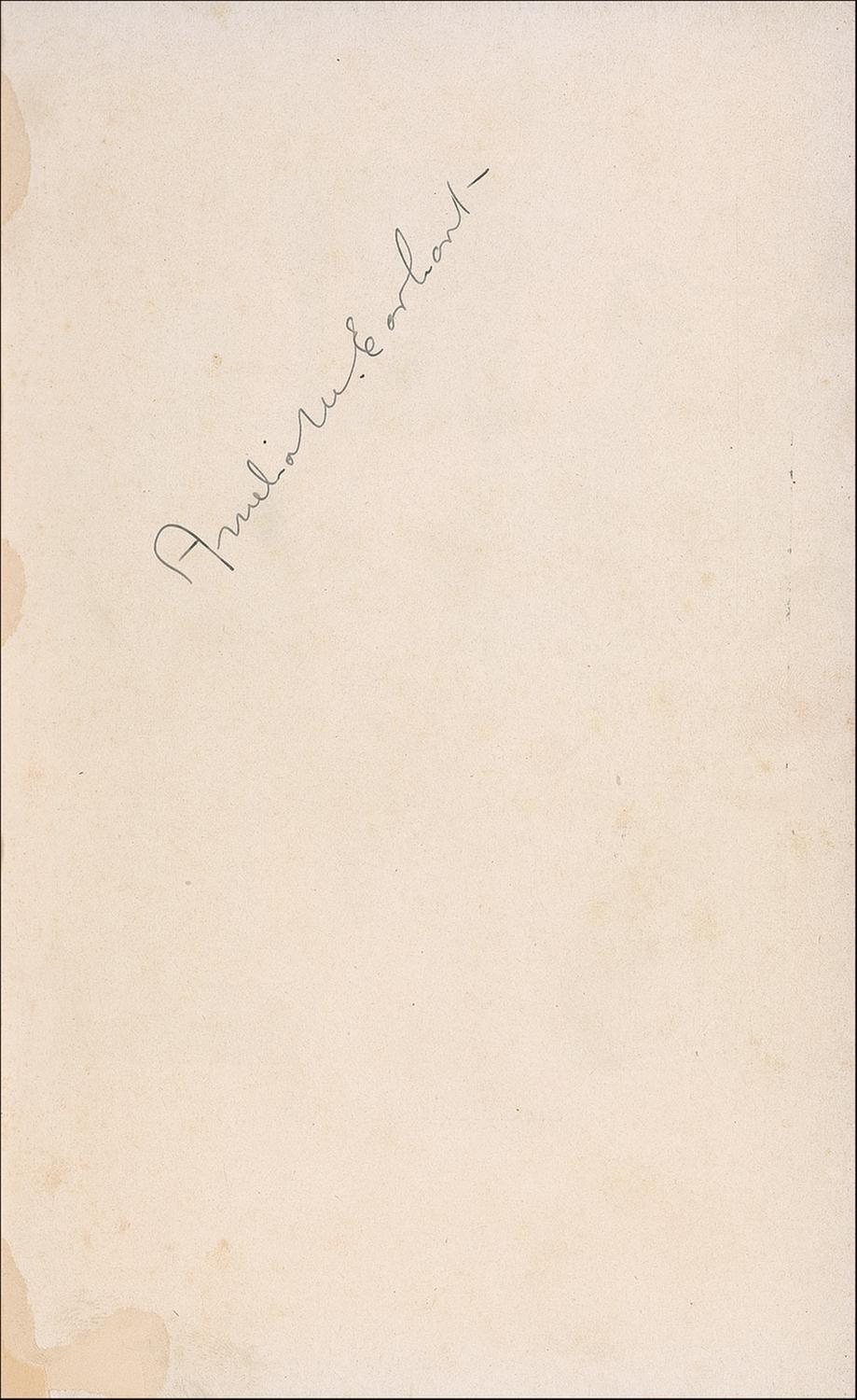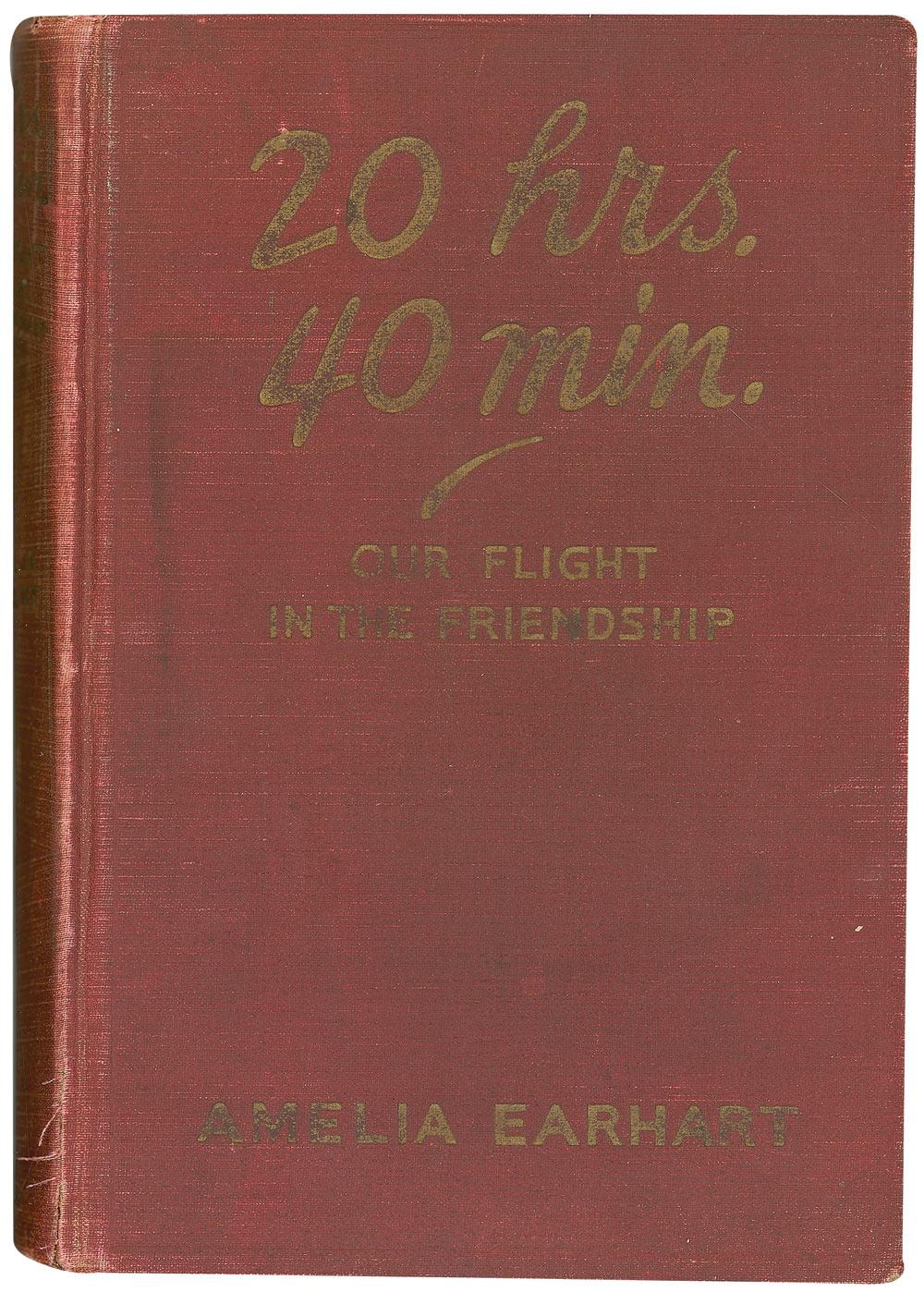 Signed book: 20 hrs, 40 min. Our Flight in the Friendship. Later printing (printed publisher’s notation under copyright states “This is a copy of the first edition.” NY: G.P. Putnam’s Sons, 1928. Hardcover, 5.75 x 8.25, 314 pages. Signed on a front free end page in black ink by Earhart. Cracked and partially separated front hinge, some light toning and foxing to signed page, trimmed and toned half-title page, toning and foxing to inside pages, some the result of a newspaper photo affixed to a back blank end page, wear and heavy soiling to covers and spine, otherwise very good condition. Despite the flaws to the book, Earhart’s signature is remarkably well-preserved.