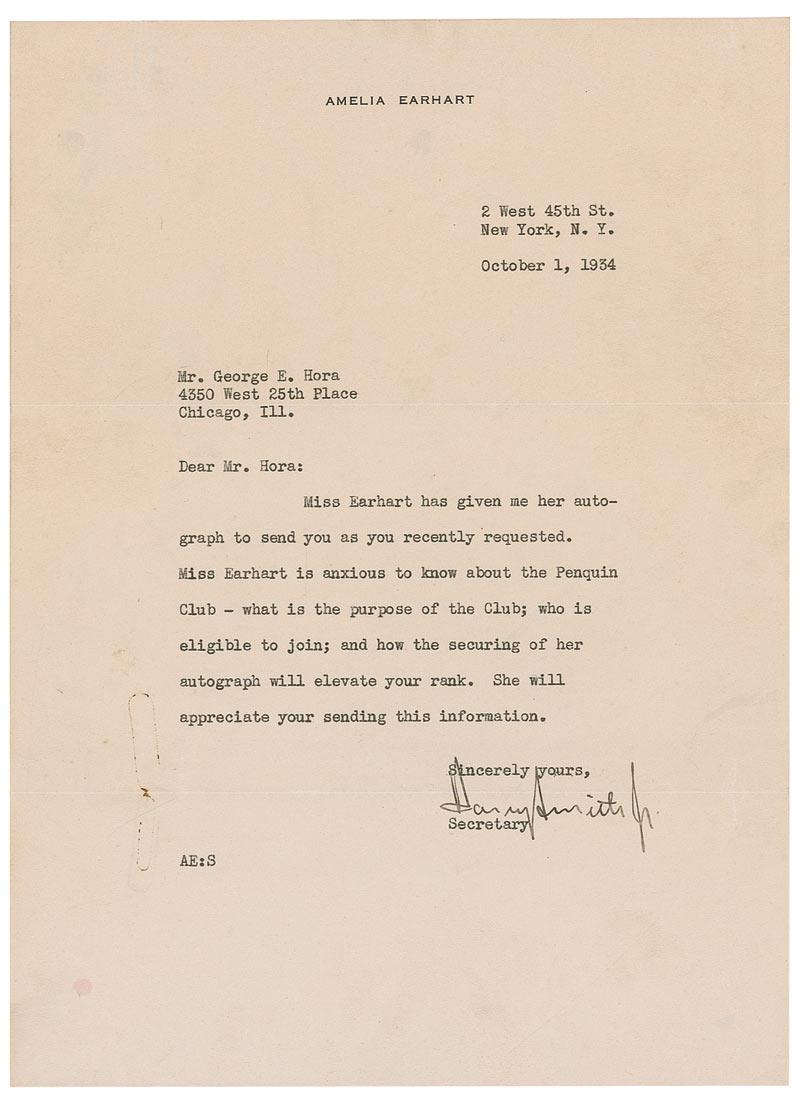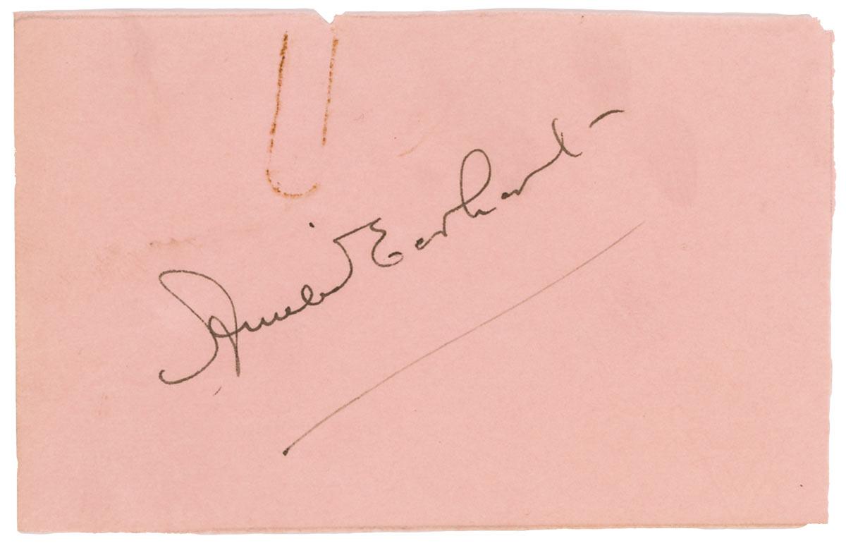 Fountain pen signature, “Amelia Earhart,” on a pink 3.5 x 2 slip. In fine condition, with a bit of edge toning and a rusty paperclip impression at the top of the slip. Accompanied by a 1934 letter of provenance from Harry Smith, Earhart’s secretary, that reads in part: “Miss Earhart has given me her autograph to send you as recently requested. Miss Earhart is anxious to know about the Penquin Club—what is the purpose of the Club; who is eligible to join; and how the securing of her autograph will elevate your rank.” The letter rates very good with paper clip impressions, rust stains, and wrinkles.