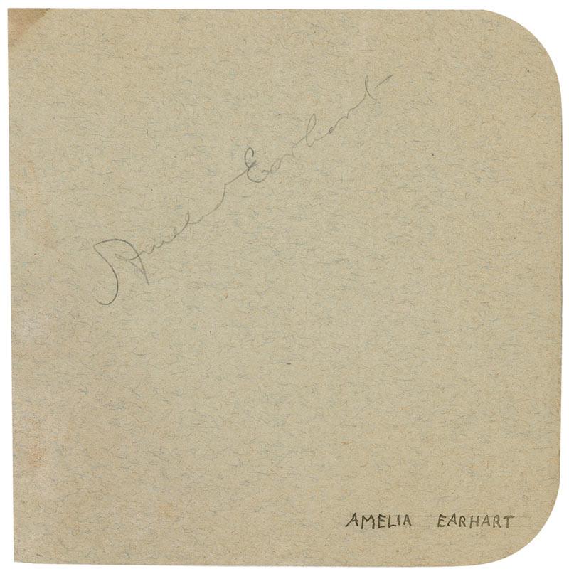 Vintage pencil signature, “Amelia Earhart,” on a light green 4.5 x 4.5 album page with a collector’s notation to bottom. Some mild toning to page and signature fairly light, but still legible, otherwise fine condition.