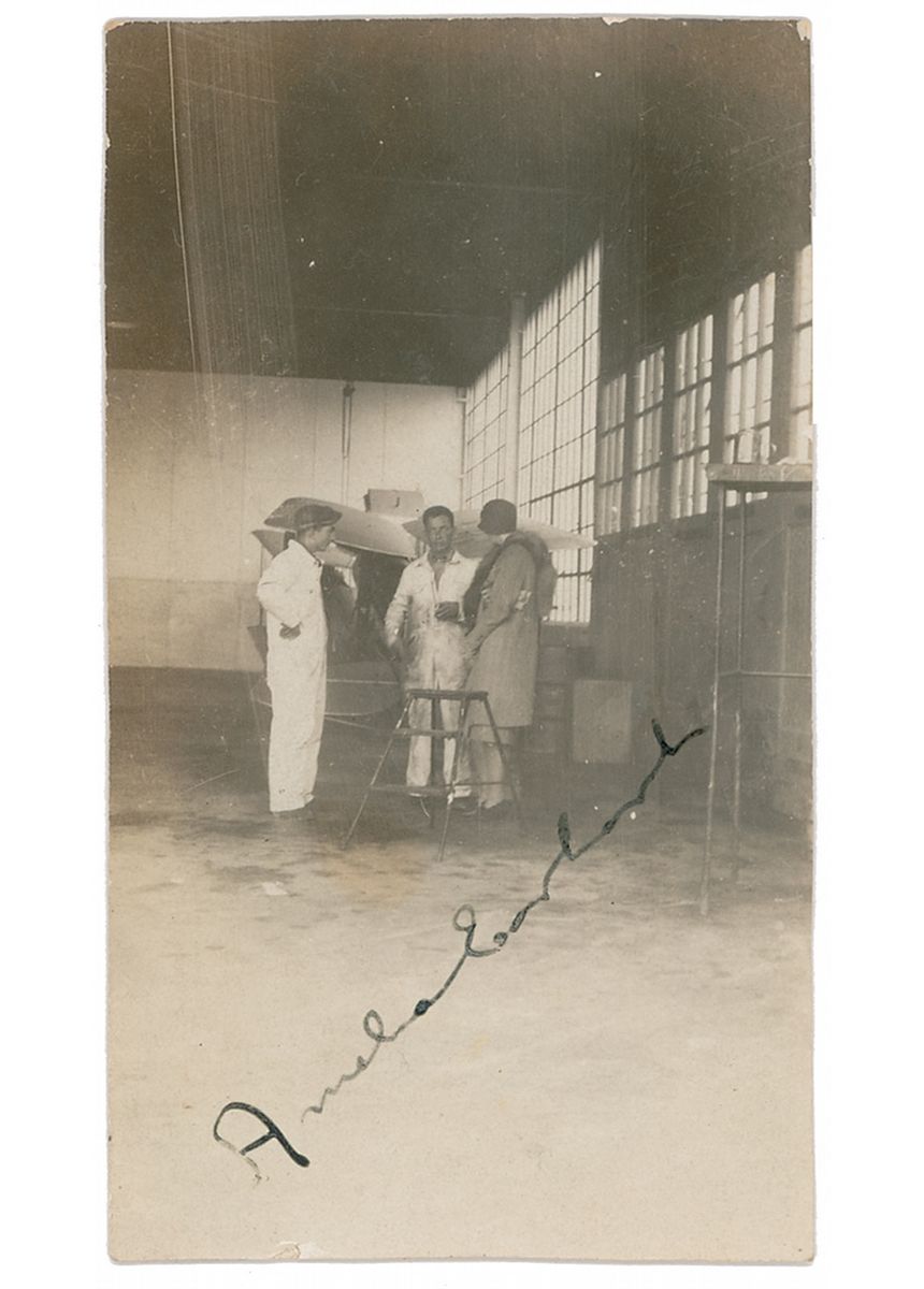 Original vintage glossy 2.25 x 4 photo of Earhart, clad in an overcoat and hat, talking to two mechanics in a hangar, signed in fountain pen. Light overall surface marks, mounting remnants to reverse, and a few light creases, otherwise fine condition.