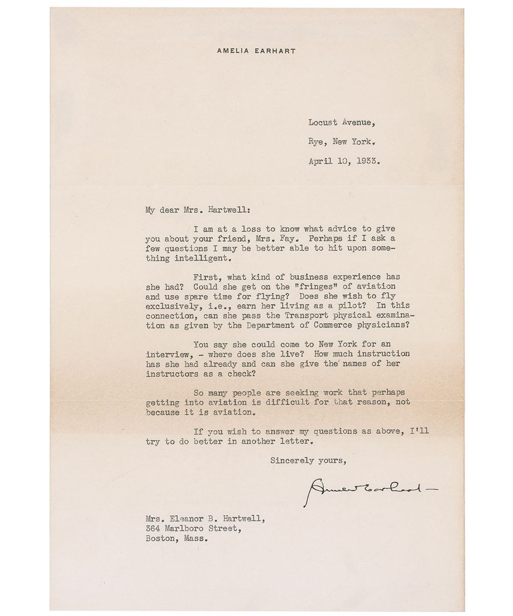 TLS, one page, 7 x 10.5, personal letterhead, April 10, 1933. Letter to a Massachusetts woman seeking advice to give a friend regarding flying. In full: “I am at a loss to know what advice to give you about your friend, Mrs. Fay. Perhaps if I ask a few questions I may be better able to hit upon something intelligent. First, what kind of business experience has she had? Could she get on the 'fringes' of aviation and use spare time for flying? Does she wish to fly exclusively, i.e., earn her living as a pilot? In this connection, can she pass the Transport physical examination as given by the Department of Commerce physicians? You say she could come to New York for an interview,—where does she live? How much instruction has she had already and can she give the names of her instructors as a check? So many people are seeking work that perhaps getting into aviation is difficult for that reason, not because it is aviation. If you wish to answer my questions as above, I’ll try to do better in another letter.” In fine condition, with a strip of light toning along one horizontal fold and edges and a few wrinkles. An excellent example as Earhart does her best to help a burgeoning aviatrix.