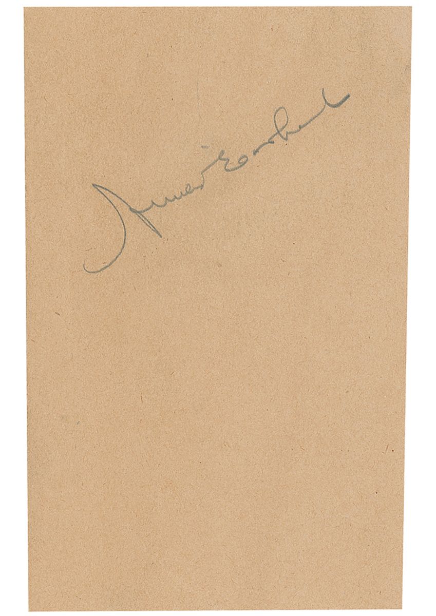 Vintage pencil signature on an off-white 3.25 x 5 slip. In fine condition.