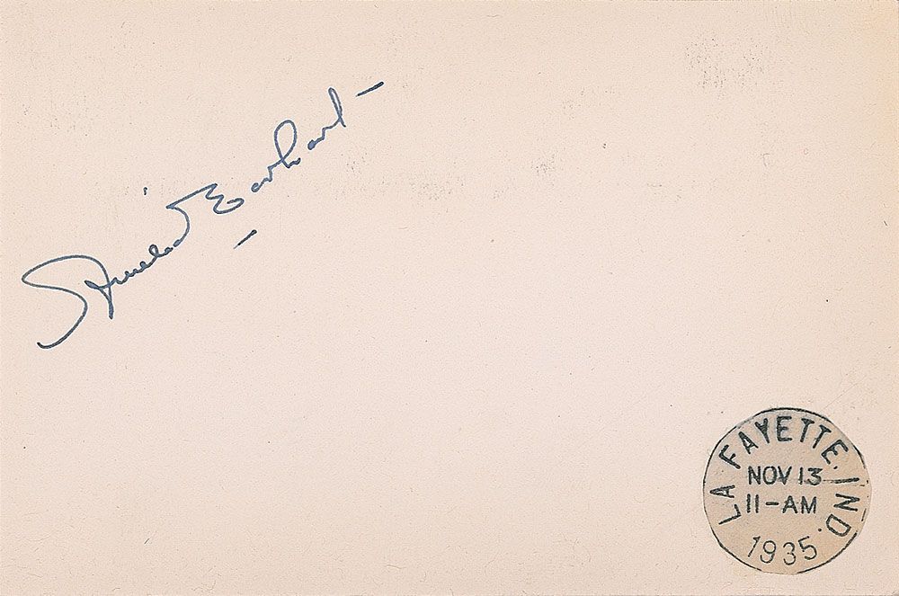 Vintage fountain pen signature, “Amelia Earhart,” on an off-white 4.5 x 3 card with a clipped November 13, 1935, Lafayette, North Dakota, postmark affixed to lower right corner. In fine condition, with mild toning, a few light dings to the edges, and moun