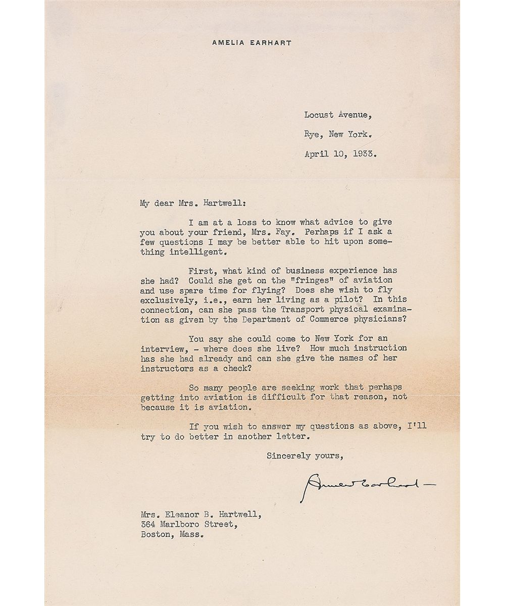 TLS, one page, 7 x 10.5, personal letterhead, April 10, 1933. Letter to a Massachusetts woman seeking advice to give a friend regarding flying. In full: “I am at a loss to know what advice to give you about your friend, Mrs. Fay. Perhaps if I ask a few questions I may be better able to hit upon something intelligent. First, what kind of business experience has she had? Could she get on the 'fringes' of aviation and use spare time for flying? Does she wish to fly exclusively, i.e., earn her living as a pilot? In this connection, can she pass the Transport physical examination as given by the Department of Commerce physicians? You say she could come to New York for an interview,—where does she live? How much instruction has she had already and can she give the names of her instructors as a check? So many people are seeking work that perhaps getting into aviation is difficult for that reason, not because it is aviation. If you wish to answer my questions as above, I’ll try to do better in another letter.” In fine condition, with a strip of light toning along one horizontal fold and edges and a few wrinkles. Just 10 days later, Earhart would fly Eleanor Roosevelt from Washington to Baltimore after a formal White House dinner.