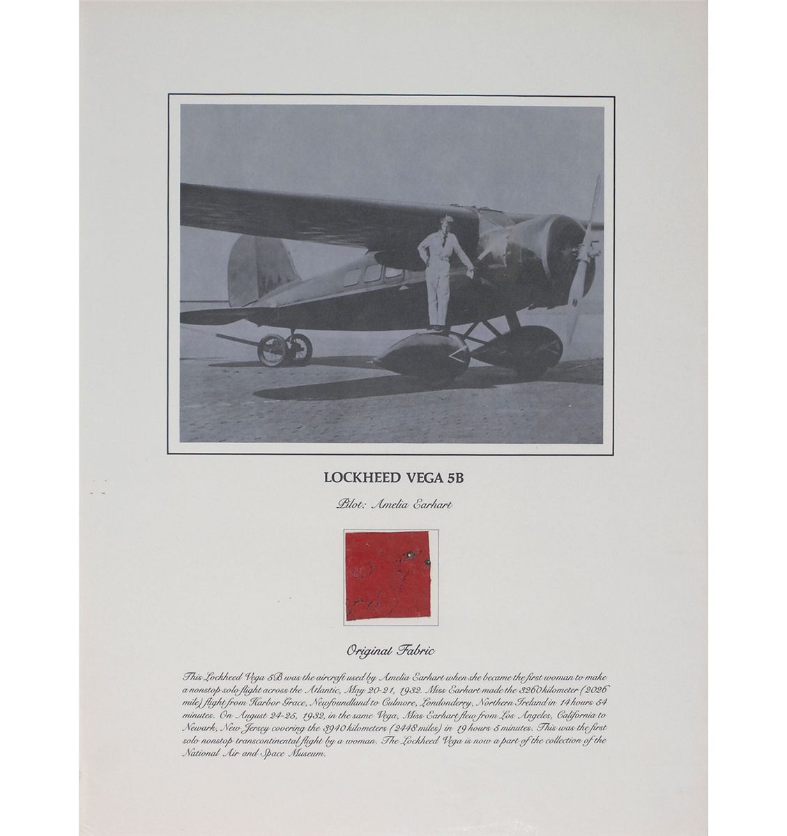 Original wing fabric swatch, 2 x 2, excised from Amelia Earhart's Lockheed Vega 5B. The red swatch is affixed to a 15 x 20 piece of textured cover stock paper with a 10 x 8 photo of Earhart standing alongside the plane. Printed beneath the original fabric is a description of her flights and records set in this aircraft. In fine condition. Some original fabric from Earhart's Lockheed Vega 5B was replaced and sold by the National Air and Space Museum when the aircraft was readied for display to the public.