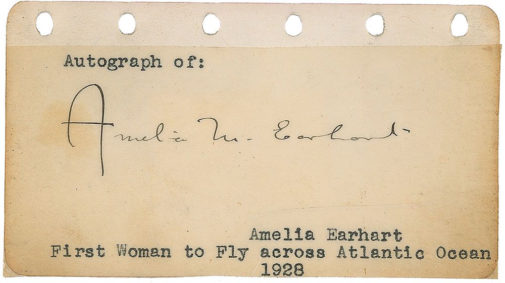 Vintage ink signature, “Amelia M. Earhart,” on an off-white 4.5 x 2.5 page. In very good condition, with toning and soiling to borders and a clear piece of tape affixed over the entire page.
