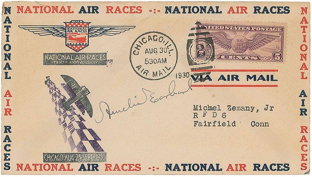 Commemorative cover with a cachet honoring the tenth anniversary of the National Air Races, signed next to the cachet in fountain pen. In fine condition, with a typed address, a couple of wrinkles, and a uniform shade of light toning.