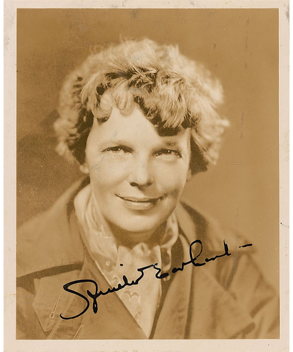 Vintage sepia glossy 3.25 x 4 photo of Earhart wearing a scarf and overcoat, signed in black ink. Photo is affixed to a 3.5 x 5.5 off-white card. Some scattered light rubbing and surface marks to finish, otherwise fine condition.