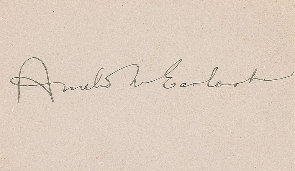 Superior vintage fountain pen signature, “Amelia M. Earhart,” on an off-white 3.25 x 2 card. In very fine condition.