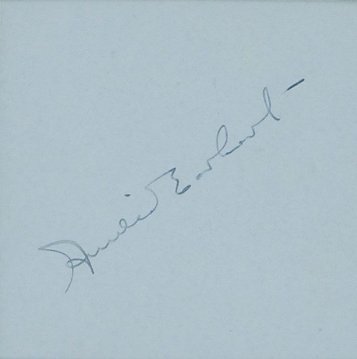 Vintage fountain pen signature, “Amelia Earhart,” on a light blue 2.5 x 2.5 album page. Attractively double-matted and framed with a portrait and small swatch of original red fabric from Earhart’s Lockheed Vega 5B to an overall size of 17 x 19.5. In fine condition. The swatch was removed from Earhart’s plane while under restoration at the Smithsonian.