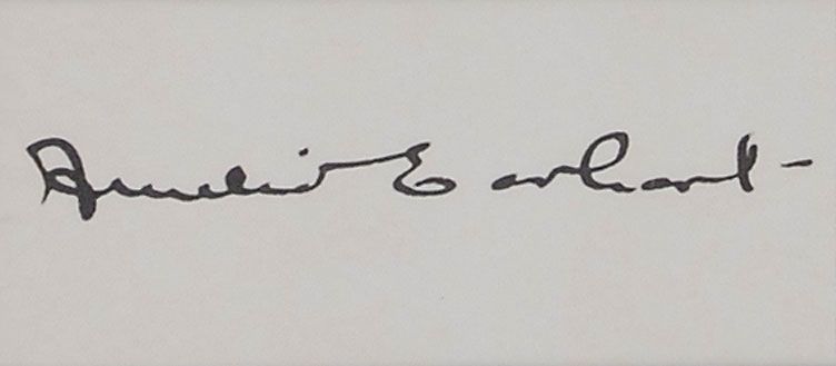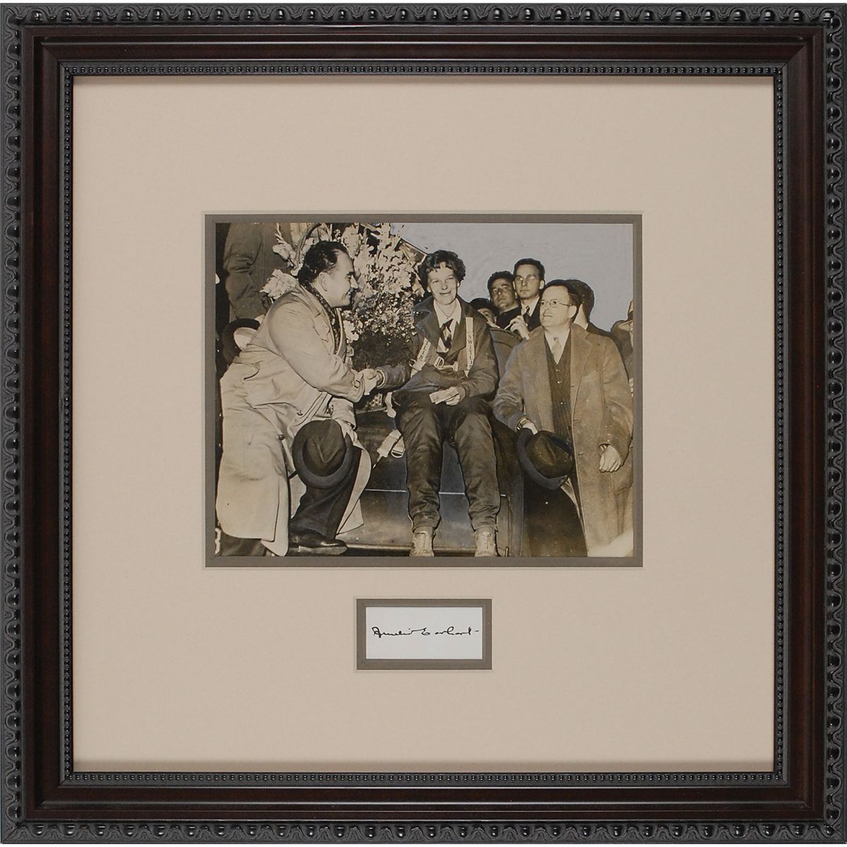 Vintage ink signature, “Amelia Earhart,” on an off-white 2.25 x 1 card. Attractively double-matted and framed with an original press photo to an overall size of 16.25 x 16.25. In very fine condition.