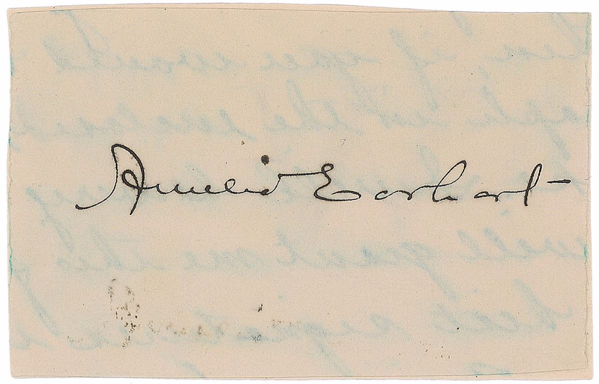 Ink signature, “Amelia Earhart,” on an off-white 3 x 2 slip clipped from the close of a letter. Affixed to a same-size sheet. In fine condition, with faint ink marks to lower portion and trivial show-through from writing to reverse.