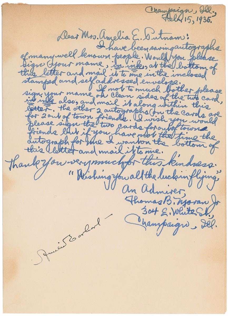 Crisp fountain pen signature, “Amelia Earhart,” at the conclusion of an autograph request letter written to her, one page, 5.25 x 7.25, February 15, 1935. Irregular toning to edges, otherwise fine condition.