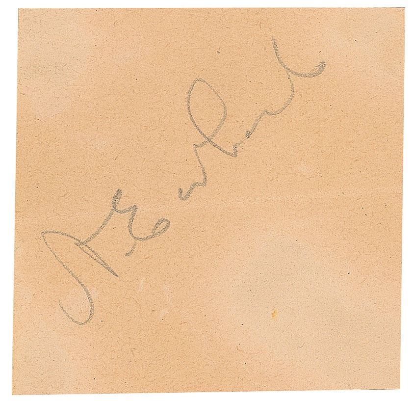 Pencil signature, “A. Earhart,” on an off-white 3 x 2.75 slip affixed to a light pink album page with a collector’s date notation of October 9, 1936. In very good to fine condition, with light irregular toning.