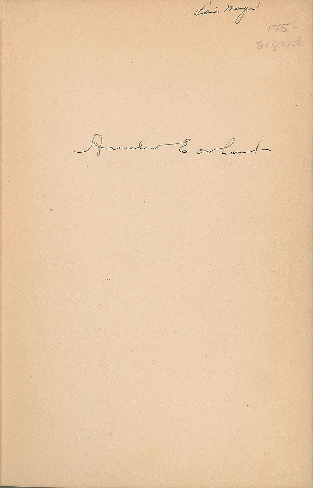 Signed book: The Fun of It: Random Records of My Own Flying and of Women in Aviation. First edition. NY: Brewer, Warren & Putnam, 1932. Hardcover, 5.25 x 8.25, 218 pages. Signed on the first free end page in black ink by Amelia Earhart. The book retains its original mini-record of Earhart’s international broadcast in a sleeve affixed to the inside of the back cover. Autographic condition: fine, with an ownership signature to the upper right corner. Book condition: VG/None, with edgewear and bumped corners. A fascinating book detailing Earhart's growing obsession with flying, with the final chapter chronicling her historic transatlantic flight.