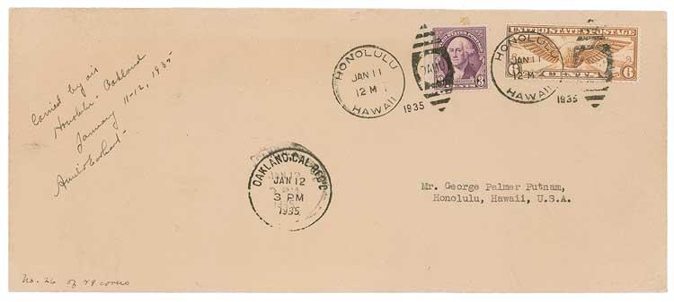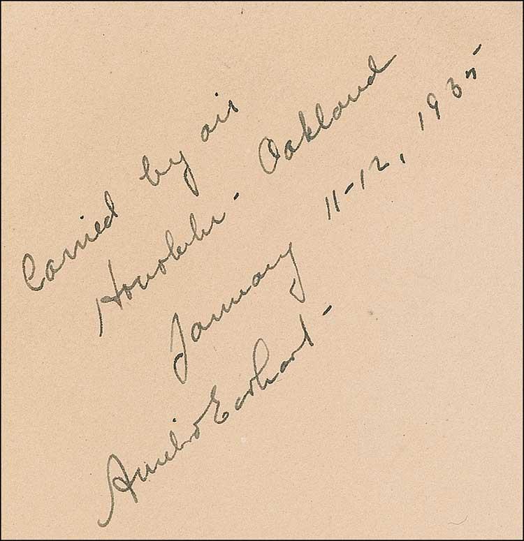 Limited edition air mail postal cover, 9.5 x 4.25, #26/49, signed in fountain pen, “Carried by air Honolulu—Oakland, January 11-12, 1935, Amelia Earhart.” Cover is addressed in type to Earhart’s husband “George Palmer Putnam, Honolulu, Hawaii, U.S.A.” Cover also bears Oakland and Honolulu postal cancellations on the front. This cover was carried aboard the first non-stop solo flight from Hawaii to California. Earhart was the first person to make the 2,408 mile solo non-stop flight from Hawaii to the mainland United States. Most of these covers have the arrival postmark on the back. This example is more desirable in that all markings are on the front of the cover. In fine condition, with a uniform shade of toning, and a couple small creases. Pre-certified John Reznikoff/PSA/DNA and RRAuction COA.