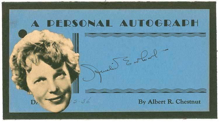 Vintage fountain pen signature, “Amelia Earhart,” on a 5.5 x 2.75 blue card from the Albert R. Chestnut collection. In fine condition, attached to a slightly larger heavy black card, with a small photo attached to the left blank area overlapping the beginning of a 1936 date notation. From his Pennsylvania home, Chestnut, a printer by profession, began collecting autographs in 1935. He sent these personally-printed cards to over a thousand celebrities and received favorable replies from the vast majority, finally retiring from collecting to raise his family when postage increased from 2¢ per card! Pre-certified PSA/DNA and RRAuction COA.