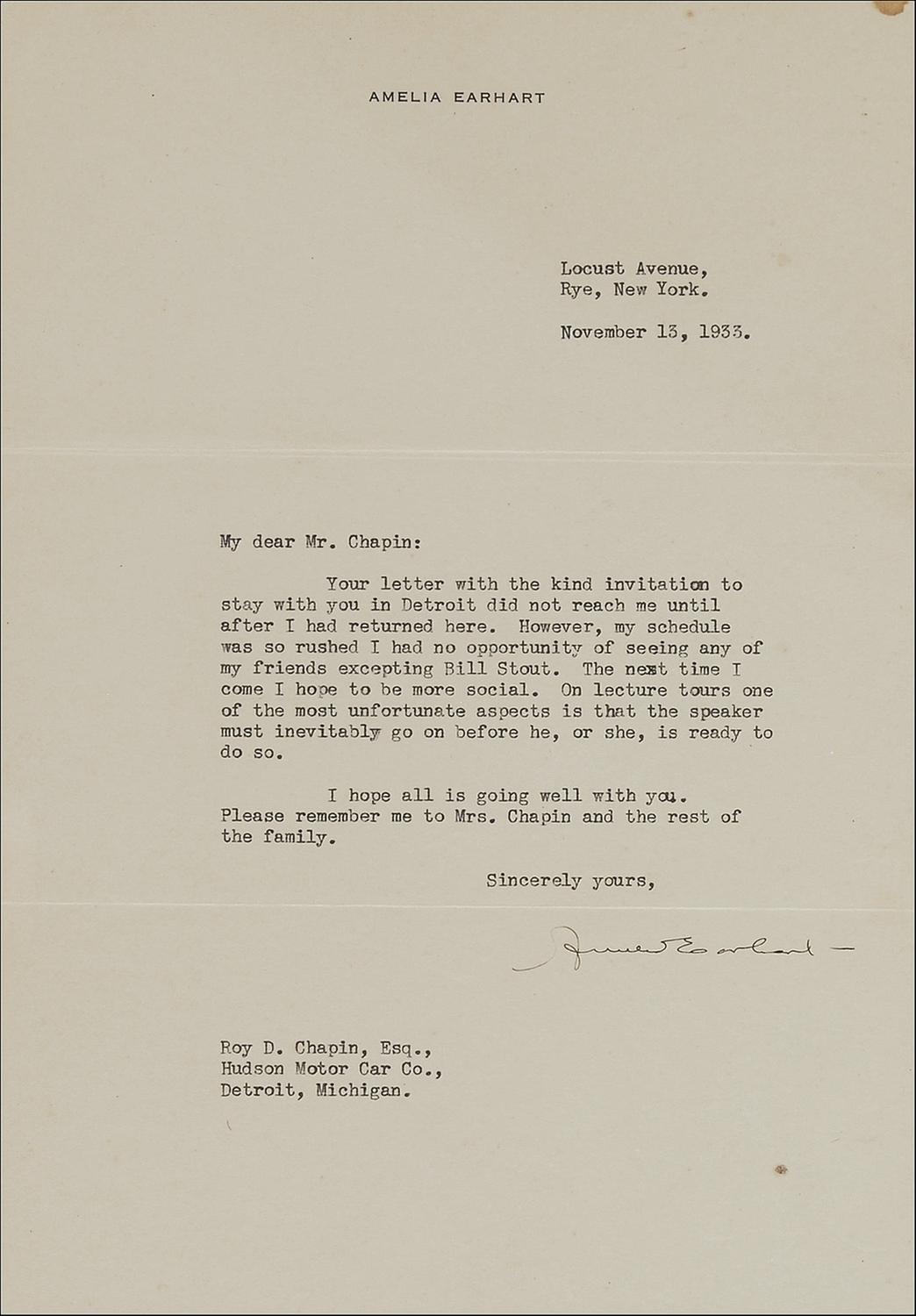 TLS, one page, 7.25 x 10.25, personal letterhead, November 13, 1933. Letter to Roy D. Chapin. In full: “Your letter with the kind invitation to stay with you in Detroit did not reach me until after I returned here. However, my schedule was so rushed I had no opportunity of seeing any of my friends excepting Bill Stout. The next time I come I hope to be more social. On lecture tours one of the most unfortunate aspects is that the speaker must inevitably go on before he, or she, is ready to do so. I hope all is going well with you. Please remember me to Mrs. Chapin and the rest of the family.” Simply matted and framed to an overall size of 17 x 21. In fine condition, with a couple of trivial spots in blank areas. Chapin was an industrialist and automaker who co-founded the Hudson Motor Car Company in 1908. The company eventually forged a relationship with the famed aviatrix, and in 1932 she participated in the christening ceremony for the new 1932 Terraplane, breaking a bottle of aviation fuel over the vehicle’s hood ornament. Chapin was lucky that Earhart was able to schedule any time for the 1932 event, as by 1933—the year of this correspondence—she did indeed have a rushed scheduled. In addition to the aforementioned lecture circuit, she became the first woman to fly non-stop coast-to-coast across the United States and set the woman’s speed transcontinental record.