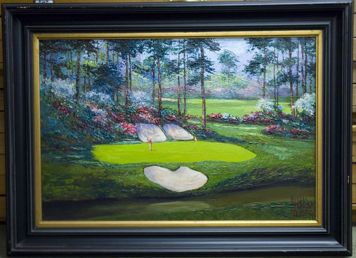 One of the last such paintings by this brilliant English-American artist, who passed away in 2014. It is a colorful acrylic on canvas, 24x36", framed in a classic style dark wood frame with gold trim. This painting of Augusta National comes with a signed book about the artist. Framed size 30x42". Ship weight approx. 25 lbs.