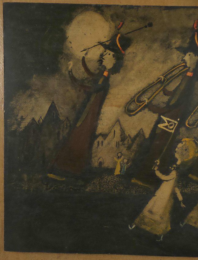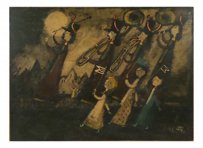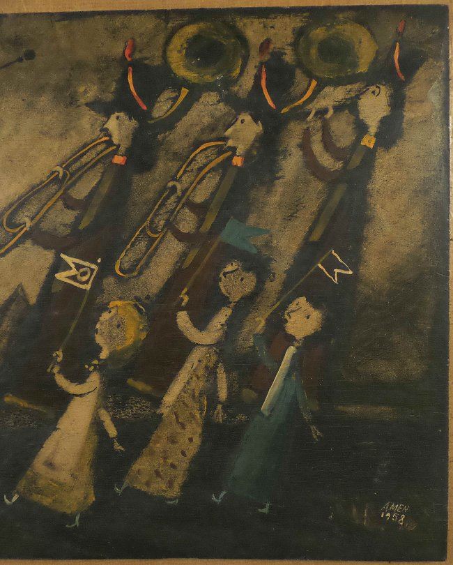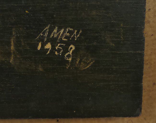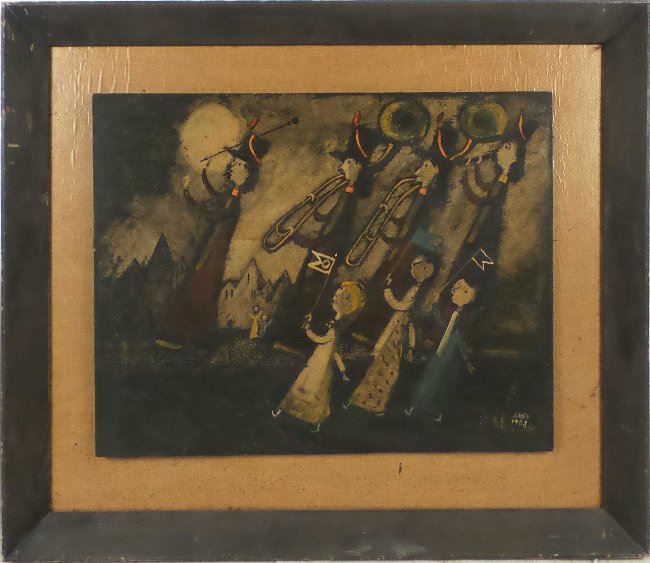 Folk art oil on board depicting children and a marching band. Signed lower right, "Amen 1958". [Art: 15" x 19 3/4" on a conforming board; Frame: 22 1/2" x 27 1/4"]. Soiling, craquelure, a few scuffs.
