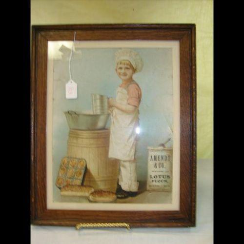 Amendt & Co Lotus Flour Advtisement Framed Advertisement. There are some tears in the Heavy paper print. The print has good color.