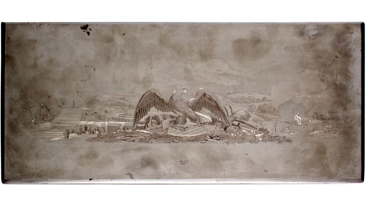 13 inches in length by 6 3/4 inches wide. Beveled edge, surfaces perfect, Eagle with harbor and surrounding country side. Provenance; Lot 1113 The Old West Franklinton Collections Aug. 11, 2006 American Numismatics Rarities, LLC. - HKA#64717
