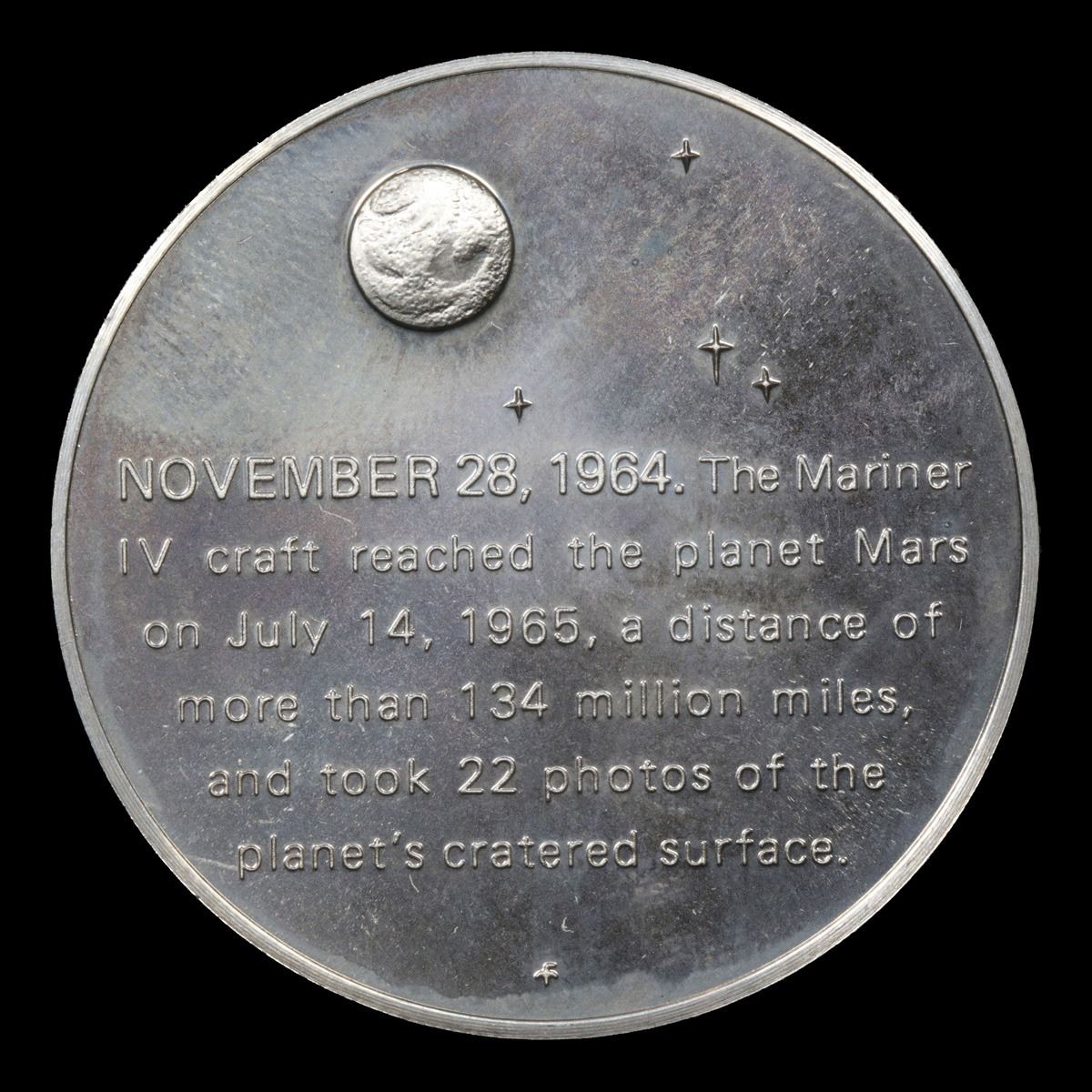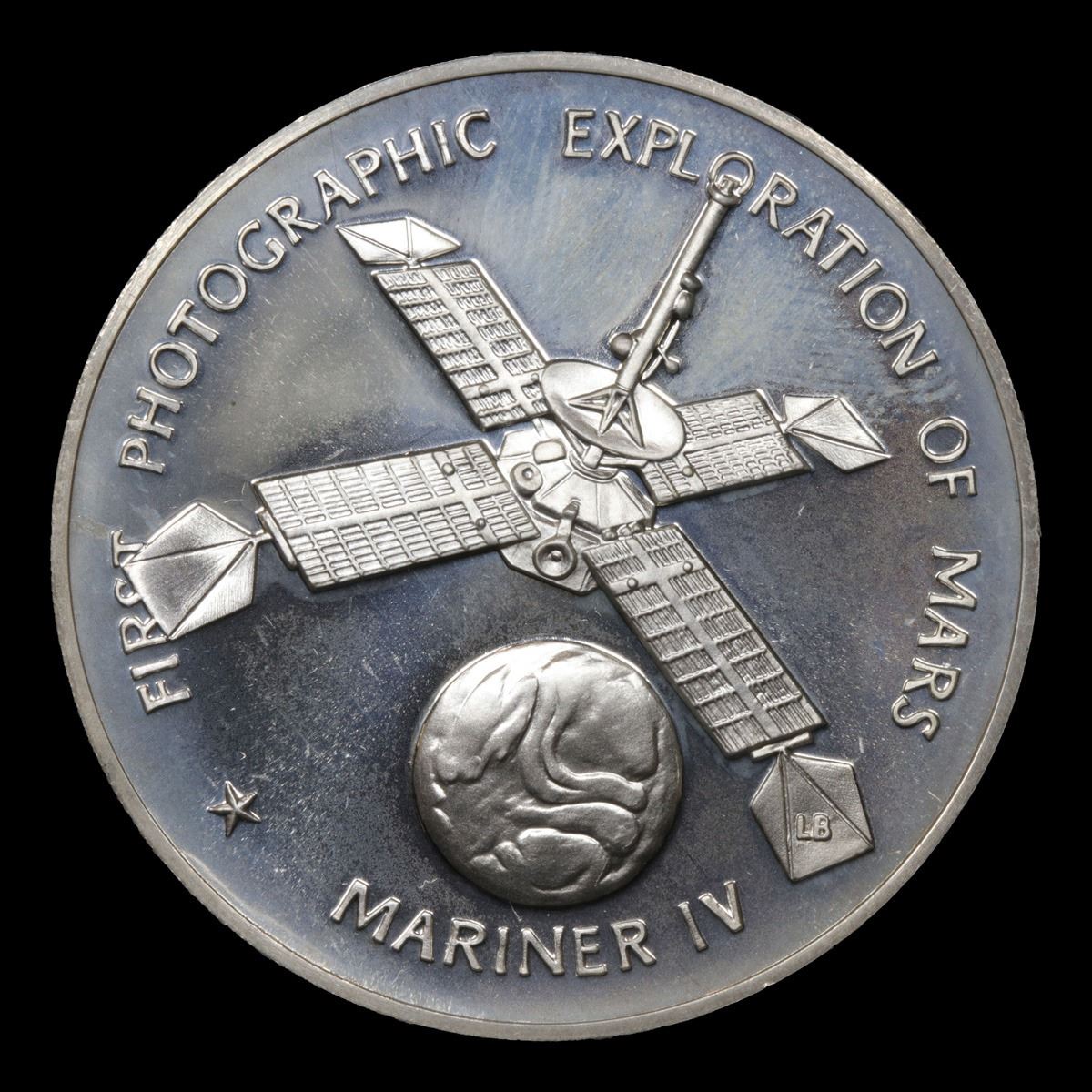 America In Space First Photographic Exploration Of Mars . . 1oz .925 Sterling Silver Round. The original series of 24 medals was minted exclusively for the men and women in the aerospace industry and also established Franklin Mint collectors. The face of each medal bears a sculptured design portraying one of the key events in the history of America in space. A distinguished board of advisers, who made space history, chose the subjects to be honored. The reverse briefly relates the history of the event portrayed. This Medal portrays Testing The Theory of Relativity on June 18th, 1976. In 1973, and again in 1976, additional medals (12 and 24 respectively) were made available to collectors of the first 24 medals. In 1977, a mini-coin collection containing the 60 designs previously minted was made available. Each mini-coin collection included a hardwood collector's case fitted with a transparent top. Each set of 12 medals contains 9.7 ounces.