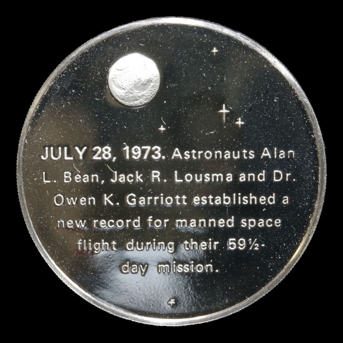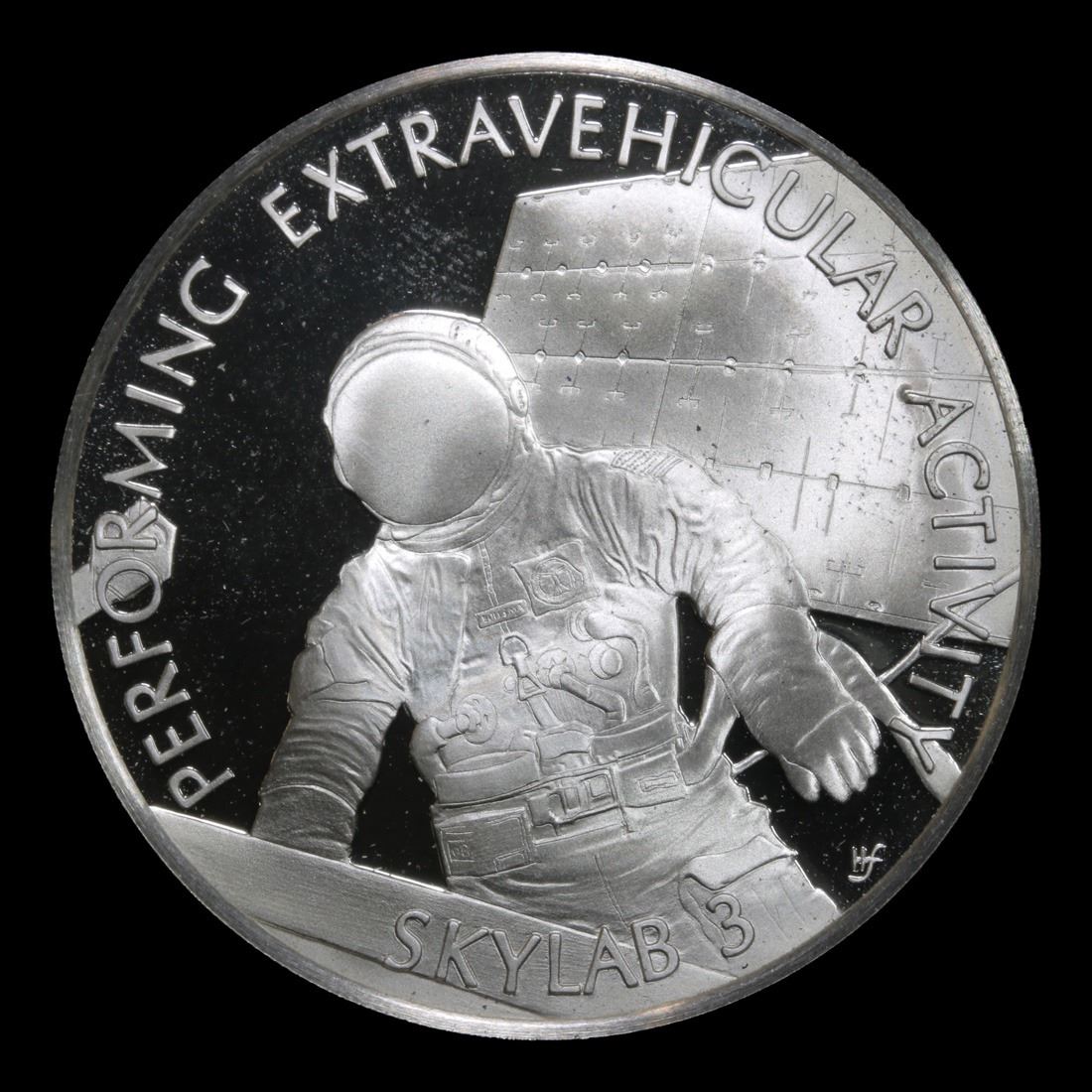 America In Space Performing Extravehicular Activity . . 1oz. .999 Silver Round Grades.        The original series of 24 medals was minted exclusively for the men and women in the aerospace industry and also established Franklin Mint collectors. We will be bringing the entire set to you throughout all of our Fall Extravaganza auction. The face of each medal bears a sculptured design portraying one of the key events in the history of America in space. A distinguished board of advisers, who made space history, chose the subjects to be honored. The reverse briefly relates the history of the event portrayed. This Medal portrays Testing The Theory of Relativity on June 18th, 1976. In 1973, and again in 1976, additional medals (12 and 24 respectively) were made available to collectors of the first 24 medals. In 1977, a mini-coin collection containing the 60 designes previously minted was made available. Each mini-coin collection included a hardwood collector's case fitted with a transparent top. Each set of 12 medals contains 9.7 ounces.