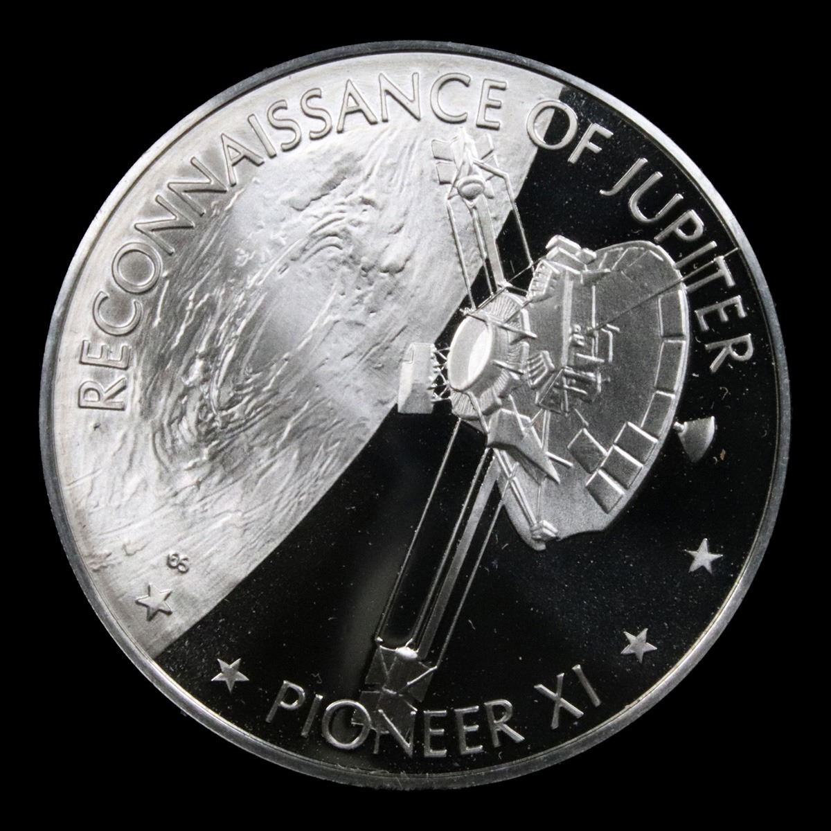 America In Space Reconnaissance Of Jupiter . . 1oz. .999 Silver Round Grades. The original series of 24 medals was minted exclusively for the men and women in the aerospace industry and also established Franklin Mint collectors. We will be bringing the entire set to you throughout all of our Fall Extravaganza auction. The face of each medal bears a sculptured design portraying one of the key events in the history of America in space. A distinguished board of advisers, who made space history, chose the subjects to be honored. The reverse briefly relates the history of the event portrayed. This Medal portrays Testing The Theory of Relativity on June 18th, 1976. In 1973, and again in 1976, additional medals (12 and 24 respectively) were made available to collectors of the first 24 medals. In 1977, a mini-coin collection containing the 60 designs previously minted was made available. Each mini-coin collection included a hardwood collector's case fitted with a transparent top. Each set of 12 medals contains 9.7 ounces.