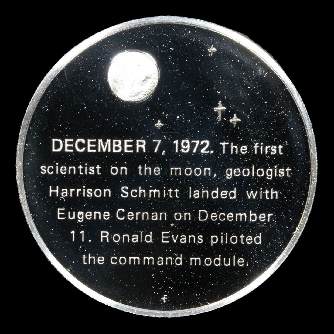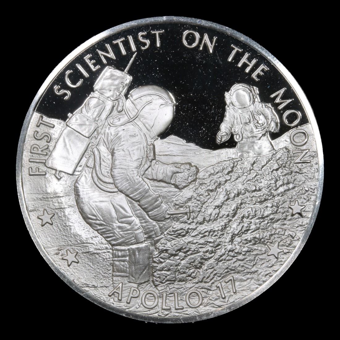 America In Space Scientist On The Moon . . 1oz. .925 Sterling Silver Round Grades. America in Space Franklin Mint Proof Sterling Silver Medal Set, First edition (1970), containing twenty-four medals in a handsome blue album/ book. We will be bringing the entire set to you throughout all of our Fall Extravaganza auction. Each medal is 39mm in diameter and weighs 0.8 ounces. The first twelve represent Unmanned Flights from the "The Goddard Rocket" of March 1926 through the "Lunar Orbiter" in August 1966. The second group of twelve features Manned Flights from Freedom 7 of May 1961 through Apollo 11 of July 1969.