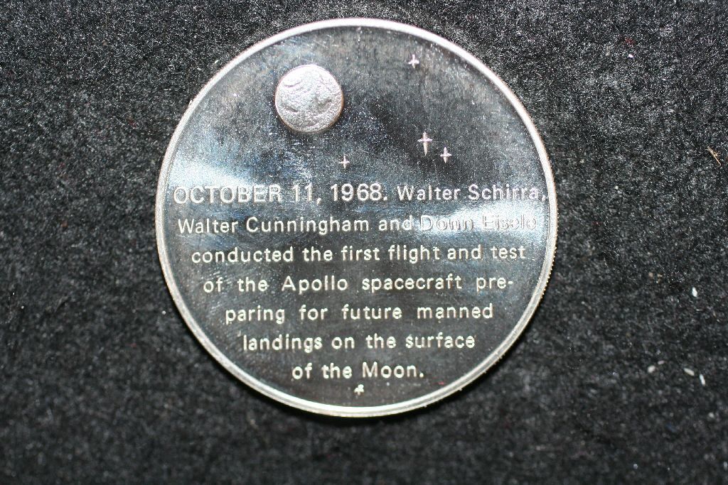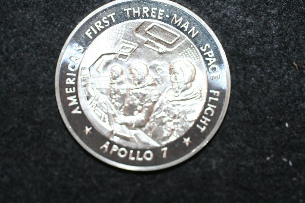 America In Space Sterling Silver Round; America's First 3-Man Flight; Apollo 7 piloted by Walter Schirra, Walter Cunningham & Donn Eisele conducted first flight & test of Apollo spacecraft preparing for future landings on the Moon; Sterling Silver 1 Oz.