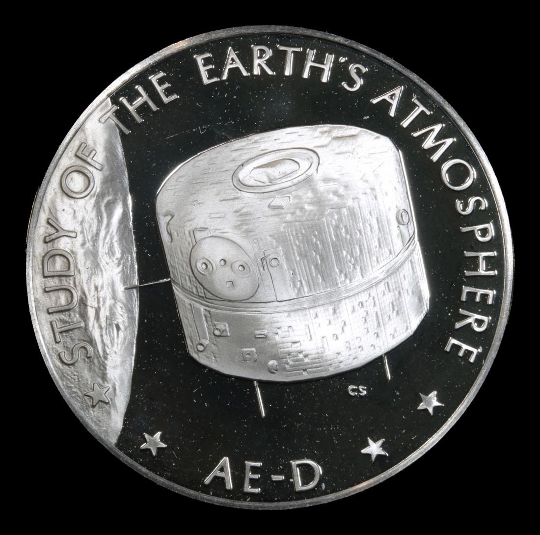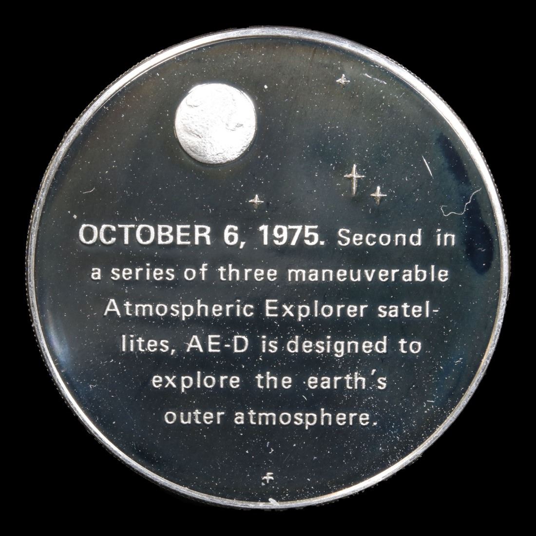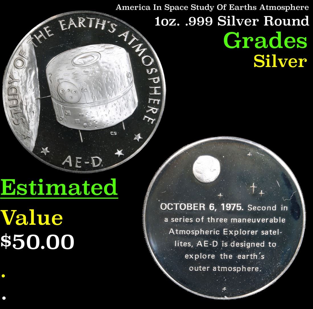 America In Space Study Of Earths Atmosphere . . 1oz. .999 Silver Round Grades. The original series of 24 medals was minted exclusively for the men and women in the aerospace industry and also established Franklin Mint collectors. We will be bringing the entire set to you throughout all of our Fall Extravaganza auction. The face of each medal bears a sculptured design portraying one of the key events in the history of America in space. A distinguished board of advisers, who made space history, chose the subjects to be honored. The reverse briefly relates the history of the event portrayed. This Medal portrays Testing The Theory of Relativity on June 18th, 1976. In 1973, and again in 1976, additional medals (12 and 24 respectively) were made available to collectors of the first 24 medals. In 1977, a mini-coin collection containing the 60 designes previously minted was made available. Each mini-coin collection included a hardwood collector's case fitted with a transparent top. Each set of 12 medals contains 9.7 ounces.