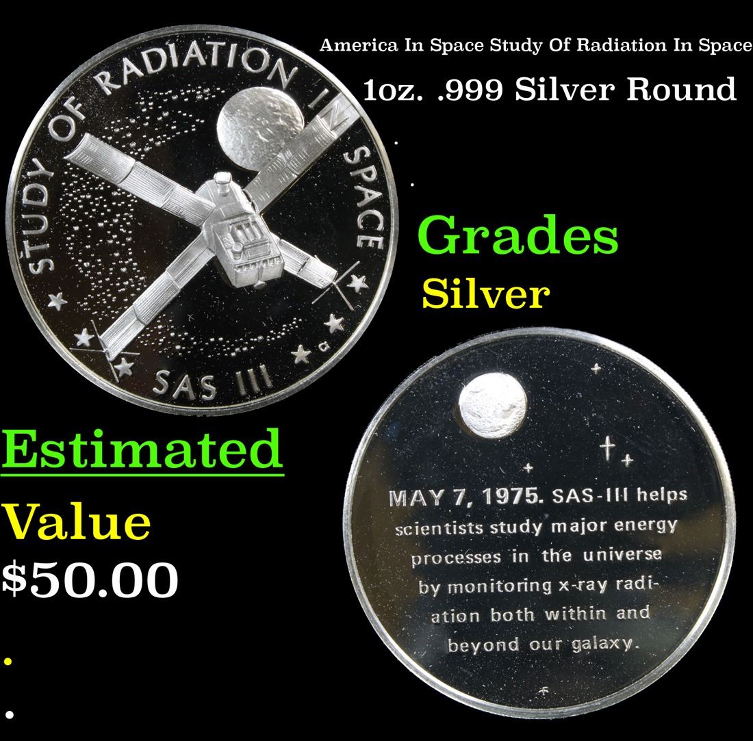 America In Space Study Of Radiation In Space . . 1oz. .999 Silver Round Grades. The original series of 24 medals was minted exclusively for the men and women in the aerospace industry and also established Franklin Mint collectors. We will be bringing the entire set to you throughout all of our Fall Extravaganza auction. The face of each medal bears a sculptured design portraying one of the key events in the history of America in space. A distinguished board of advisers, who made space history, chose the subjects to be honored. The reverse briefly relates the history of the event portrayed. This Medal portrays Testing The Theory of Relativity on June 18th, 1976. In 1973, and again in 1976, additional medals (12 and 24 respectively) were made available to collectors of the first 24 medals. In 1977, a mini-coin collection containing the 60 designes previously minted was made available. Each mini-coin collection included a hardwood collector's case fitted with a transparent top. Each set of 12 medals contains 9.7 ounces.
