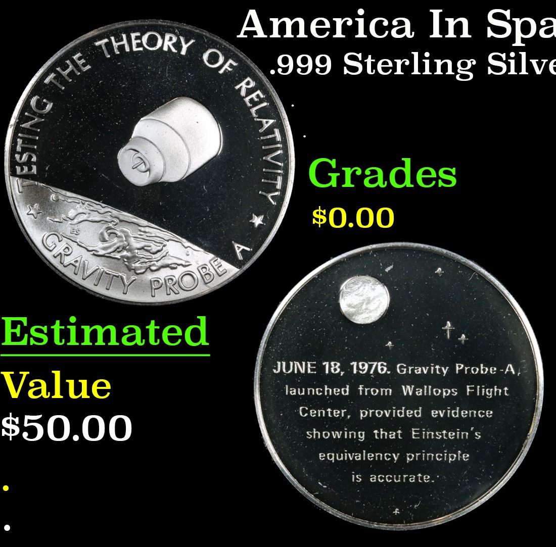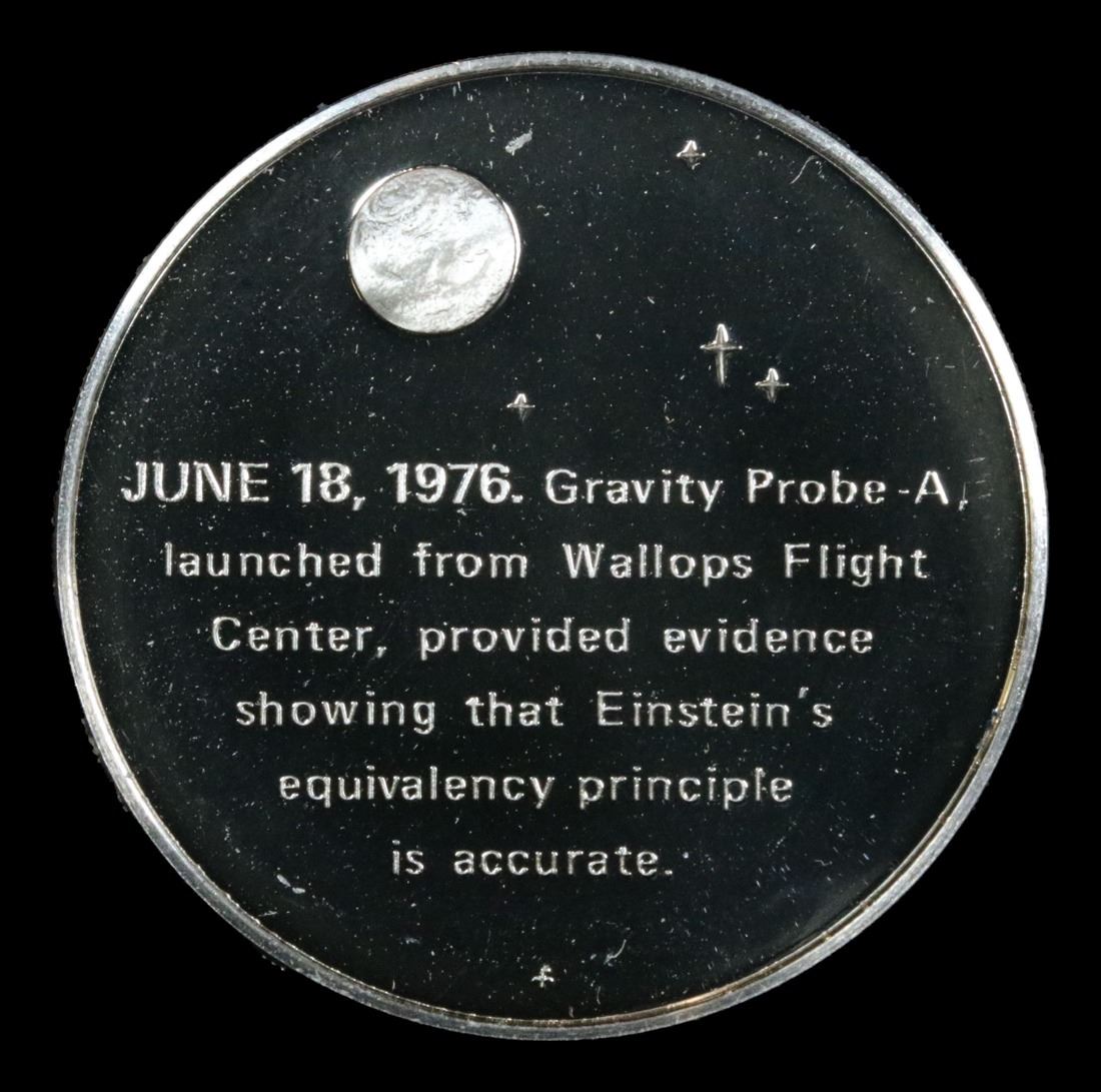 America In Space Testing The Theory Of Relativity . . .999 Sterling Silver Round. The original series of 24 medals was minted exclusively for the men and women in the aerospace industry and also established Franklin Mint collectors. The face of each medal bears a sculptured design portraying one of the key events in the history of America in space. A distinguished board of advisers, who made space history, chose the subjects to be honored. The reverse briefly relates the history of the event portrayed. This Medal portrays Testing The Theory of Relativity on June 18th, 1976. In 1973, and again in 1976, additional medals (12 and 24 respectively) were made available to collectors of the first 24 medals. In 1977, a mini-coin collection containing the 60 designes previously minted was made available. Each mini-coin collection included a hardwood collector's case fitted with a transparent top. Each set of 12 medals contains 9.7 ounces.