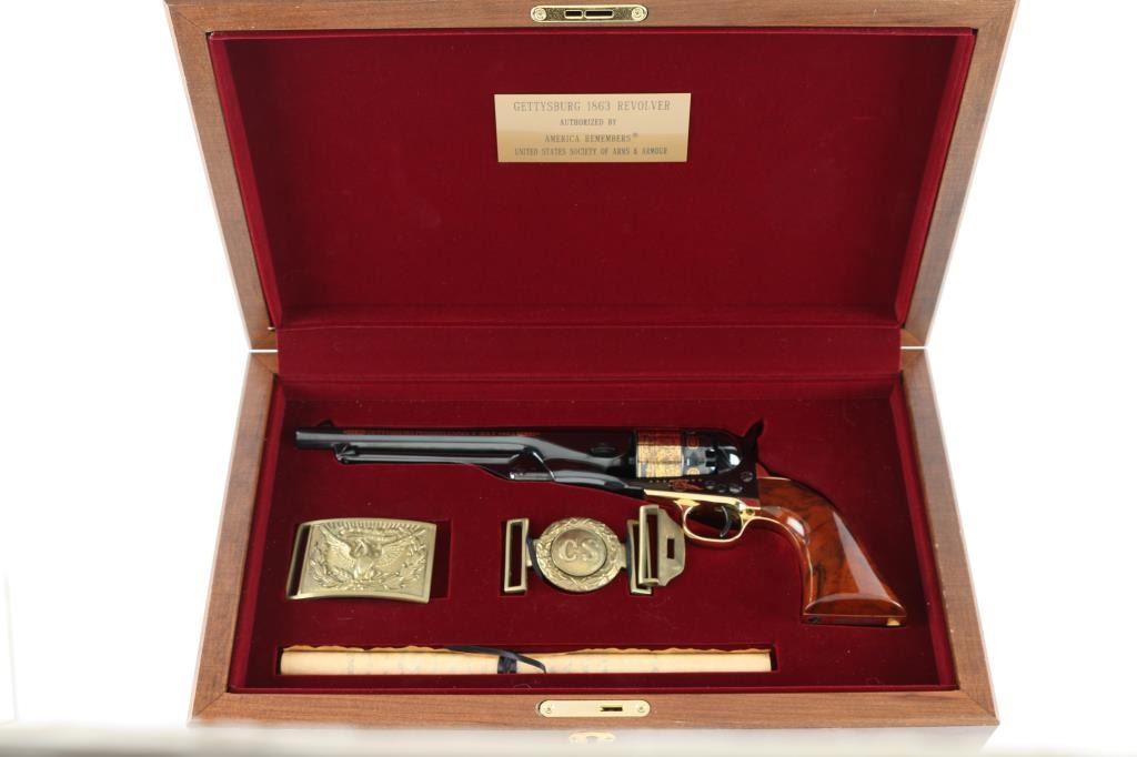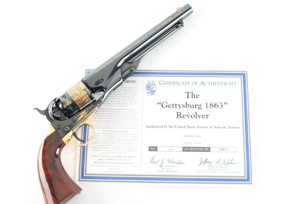 Cased, highly embellished limited edition reproduction of the Colt 1860 Army celebrating the Battle of Gettysburg. #1568 of 1,863 produced by America Remembers and authorized by the United States Society of Arms & Armour in cooperation with the Civil War Trust. Features a high luster blued finish with 24kt gold accents including: “We here highly resolve that these dead shall not have died in vain”, “Gettysburg, Pennsylvania, July 1863”, Pickett’s Charge panoramic cylinder scene, cannons and floral embellishment. Also features a one piece oil finished walnut grip and four screw frame with shoulder stock cuts in the recoil shield & backstrap. Includes a locking wood presentation case with maroon velvet lined French fitted interior with Union & Confederate belt buckles and rolled replica of the Gettysburg Address on parchment paper. Certificate of authenticity and other documents. Revolver displays no observed wear. The case shows some scratches and small losses. Condition is like NRA Perfect in case. ***Antique Firearm***