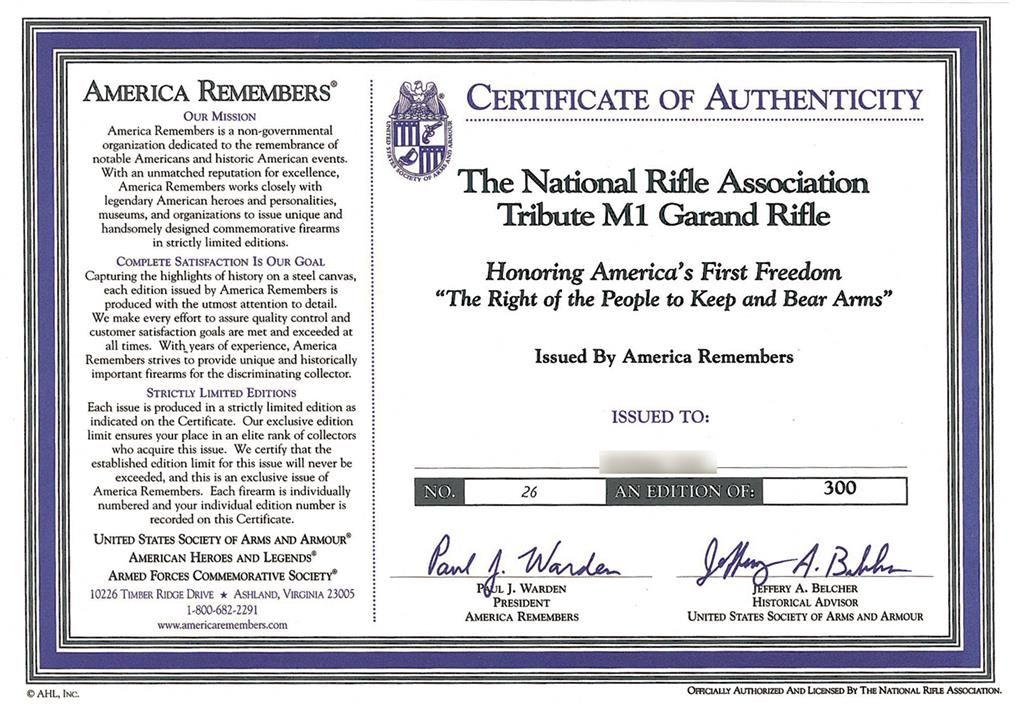 America Remembers Gold Highlighted NRA Commemorative Springfield Armory M1 Garand Semi-Automatic Rifle
