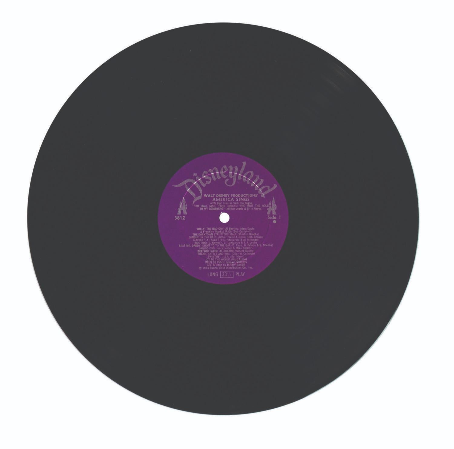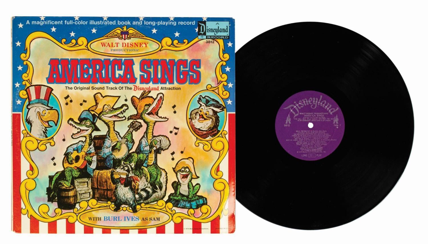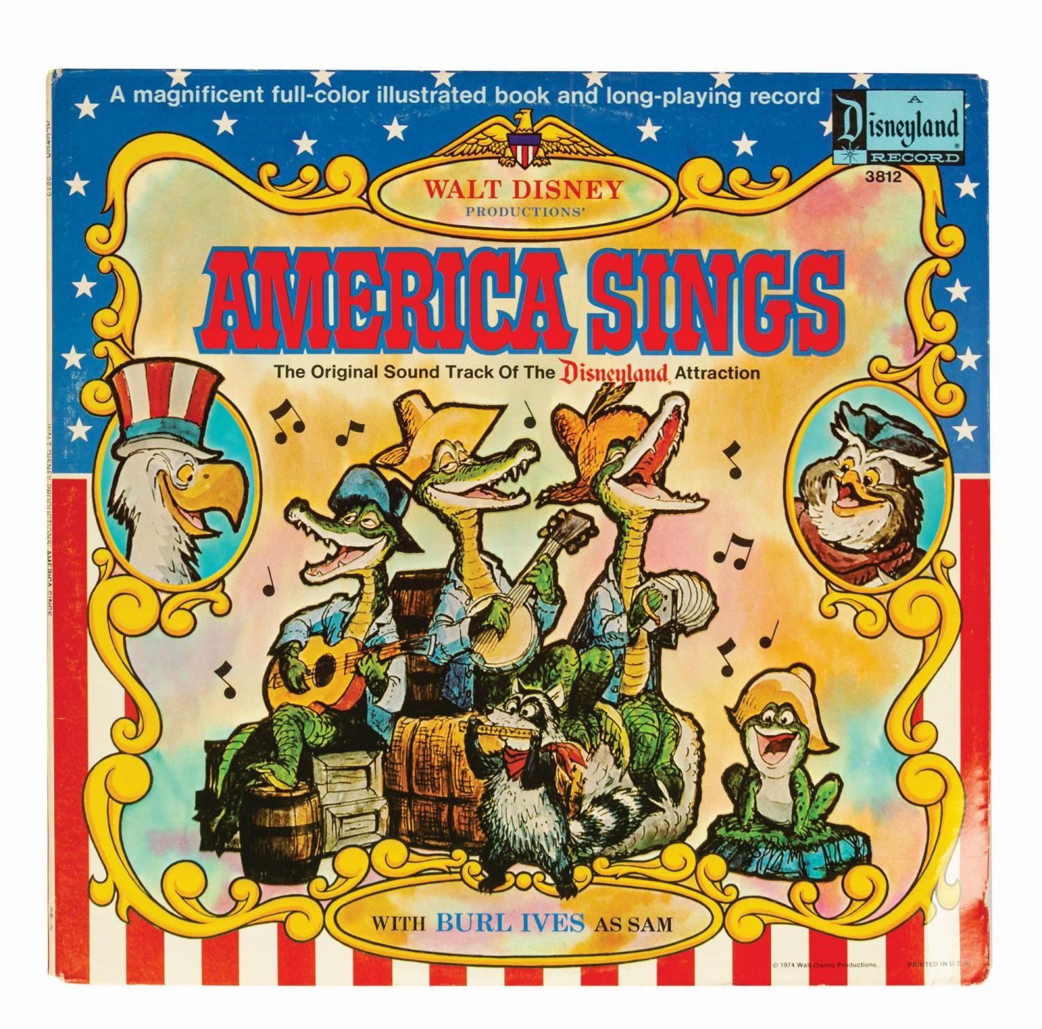 (Disneyland, 1974) A vintage Walt Disney Productions' America Sings: The Original Sound Track of the Disneyland Attraction long-playing vinyl record. The record features 39 songs and is housed in the original sleeve which opens to reveal an 11-page book with illustrations by Marc Davis tracing the history of American music. Measuring 12" in diameter, the record is in fine condition with minimal wear. The sleeve measures 12.5"x12.5" and is in very good condition with edge wear, a crease to the lower right corner, and oxidation to the booklet's staple binding.