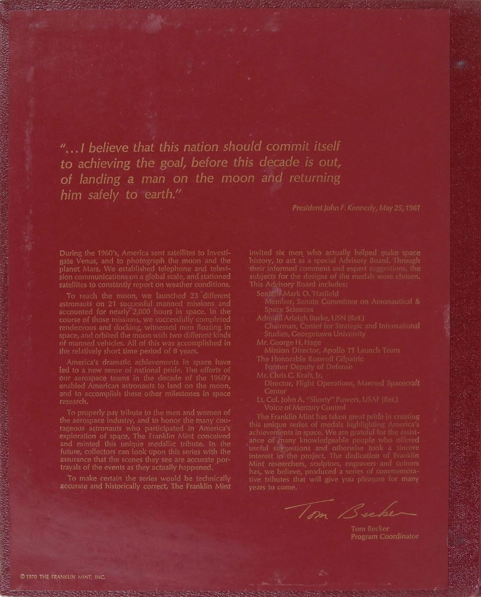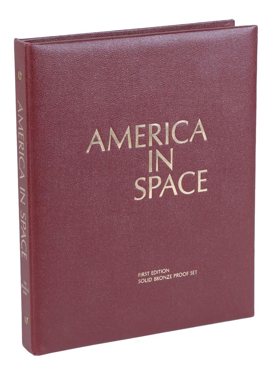 Franklin Mint first edition solid bronze proof set of 36 medallions entitled “America in Space,” in a 8.75 x 10.75 presentation binder, portraying the milestones of unmanned and manned American spaceflights. In fine condition.