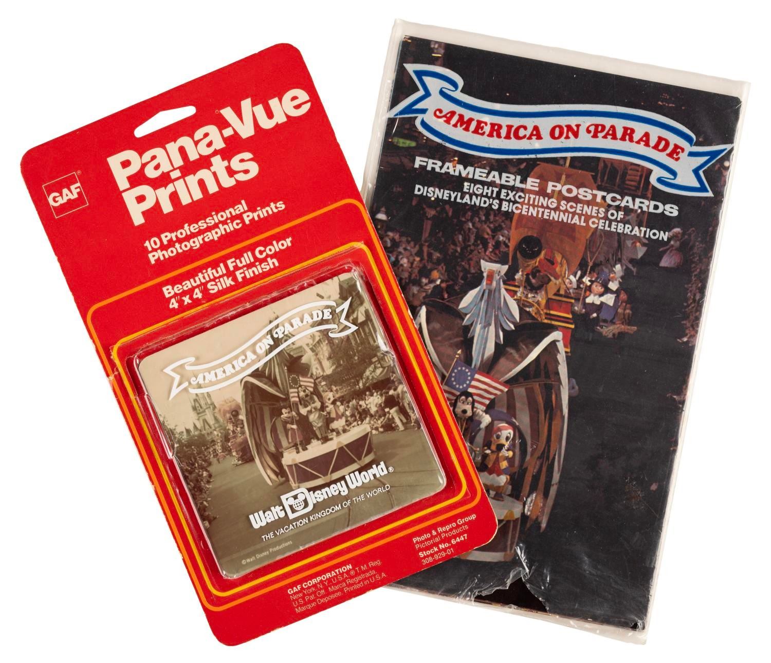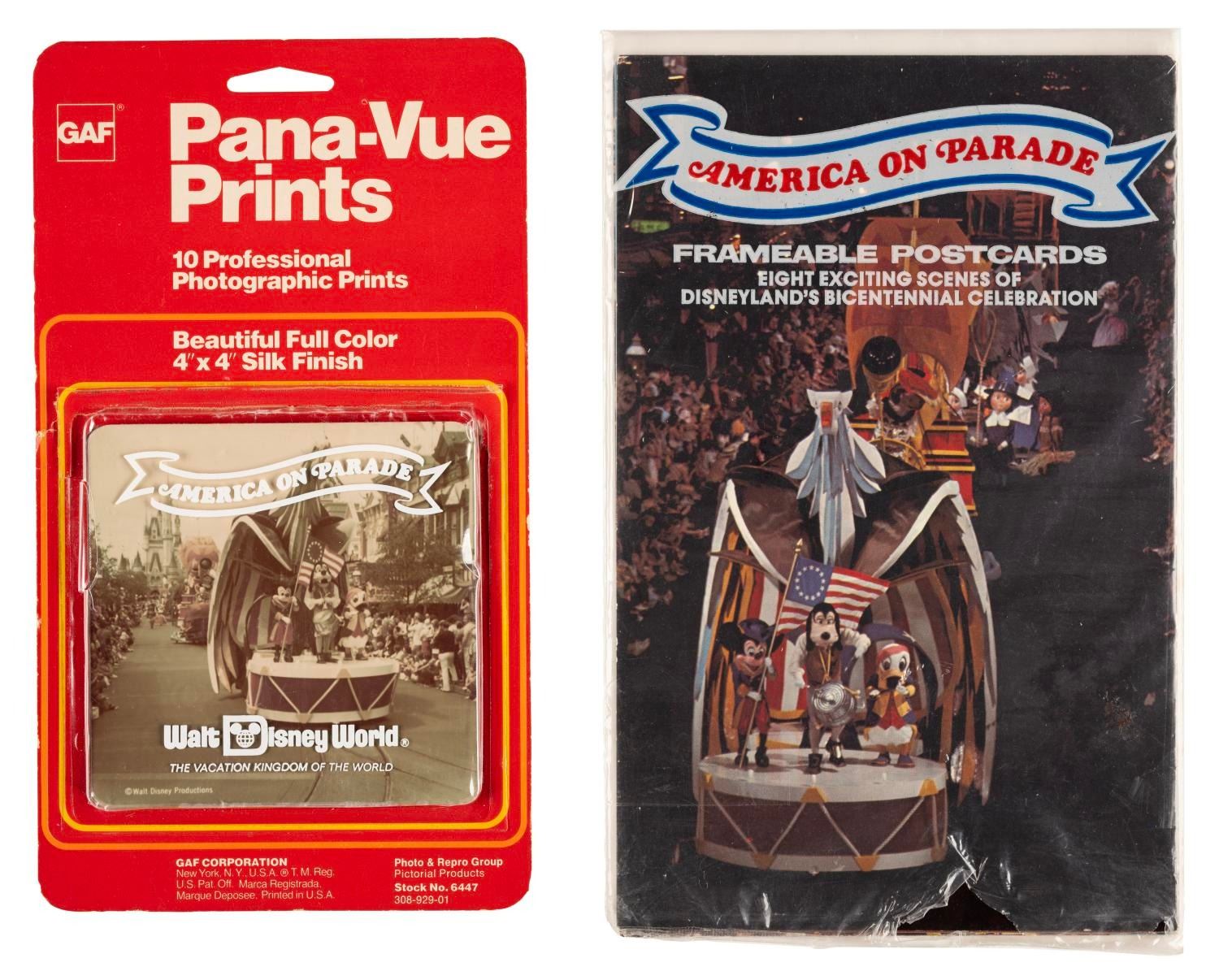 (Disneyland/GAF, 1975-76) A set of eight color photograph postcards, and ten Pana-Vue Prints from Disneyland's bicentennial celebration "America on Parade." The postcards measure 5.79"x9" and are still in the original packaging which displays a small hole along the bottom edge. The Pana-Vue prints measure 4"x4" each, and are in the original packaging which measures 5"x9", the prints and packaging are in very good condition with light wear,