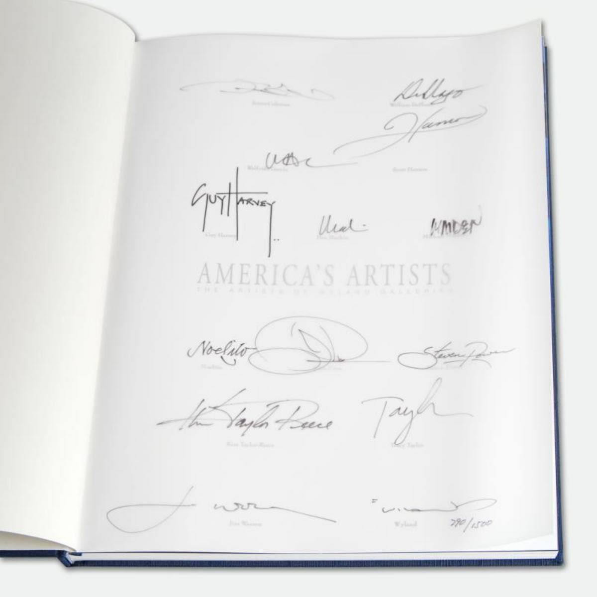 Wyland's exquisite and colorful paintings are expressive, emotive and world-famous. "America's Artists: The Artists of Wyland Galleries" (2004) is a deluxe limited edition Collector's Fine Art hardcover book with text by Wyland featuring the work of 13 of his esteemed artists! Numbering 160 pages with full color text and images, this book is hand signed by (in alphabetical order): James Coleman, William DeShazo, Walfrido Garcia, Scott Hanson, Guy Harvey, Dan Mackin, Michael Maiden, Noelito, John Pitre, Steven Power, Kim Taylor-Reece, Tracy Taylor, Jim Warren, and of course, Wyland. Comes in a special Collector's Gift Box and includes a Limited Edition Lithograph of Wyland's "Ocean Passion" measuring approx. 8" x 11" (with border); 7.5" x 10" (image), numbered and hand signed by Wyland. This book is numbered out of only 1500, and features a vellum front page that is numbered, and hand signed by Wyland and all of his artists! Includes Certificate of Authenticity. Measures approx. 10" (width) x 13" (height) x 1/2" (thick). Reference #: 190394.