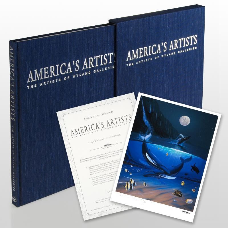 Wyland's exquisite and colorful paintings are expressive, emotive and world-famous. "America's Artists: The Artists of Wyland Galleries" (2004) is a deluxe limited edition Collector's Fine Art hardcover book with text by Wyland featuring the work of 13 of his esteemed artists! Numbering 160 pages with full color text and images, this book is hand signed by (in alphabetical order): James Coleman, William DeShazo, Walfrido Garcia, Scott Hanson, Guy Harvey, Dan Mackin, Michael Maiden, Noelito, John Pitre, Steven Power, Kim Taylor-Reece, Tracy Taylor, Jim Warren, and of course, Wyland. Comes in a special Collector's Gift Box and includes a Limited Edition Lithograph of Wyland's "Ocean Passion" measuring approx. 8" x 11" (with border); 7.5" x 10" (image), numbered and hand signed by Wyland. This book is numbered out of only 1500, and features a vellum front page that is numbered, and hand signed by Wyland and all of his artists! Includes Certificate of Authenticity. Measures approx. 10" (width) x 13" (height) x 1/2" (thick). Retail Price $750. PRICE INCUDES FREE SHIPPING IN THE U.S. - SHIPPING WILL BE ADDED TO YOUR INVOICE FOR ALL BUYERS OUTSIDE OF THE U.S.