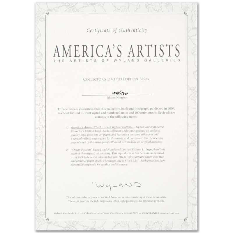 Wyland's exquisite and colorful paintings are expressive, emotive and world-famous. "America's Artists: The Artists of Wyland Galleries" (2004) is a deluxe limited edition Collector's Fine Art hardcover book with text by Wyland featuring the work of 13 of his esteemed artists! Numbering 160 pages with full color text and images, this book is hand signed by (in alphabetical order): James Coleman, William DeShazo, Walfrido Garcia, Scott Hanson, Guy Harvey, Dan Mackin, Michael Maiden, Noelito, John Pitre, Steven Power, Kim Taylor-Reece, Tracy Taylor, Jim Warren, and of course, Wyland. Comes in a special Collector's Gift Box and includes a Limited Edition Lithograph of Wyland's "Ocean Passion" measuring approx. 8" x 11" (with border); 7.5" x 10" (image), numbered and hand signed by Wyland. This book is numbered out of only 1500, and features a vellum front page that is numbered, and hand signed by Wyland and all of his artists! Includes Certificate of Authenticity. Measures approx. 10" (width) x 13" (height) x 1/2" (thick).