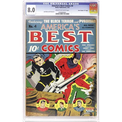 <B>America's Best Comics #4 Davis Crippen ("D" Copy) pedigree (Better Publications, 1943) CGC VF 8.0 Cream to off-white pages.</B></I> The only copy certified with a grade above VG 4.0 as of this writing, this copy is also the first we've ever seen of the early issue here at Heritage! This series filled the same role for Better/Nedor that <B>All Winners</B></I> did for Timely, namely to provide a showcase for the best characters from other titles. This issue's coverboys (drawn by an unknown hand) are the Black Terror and Pyroman. Overstreet 2006 VF 8.0 value = $363. CGC census 6/06: 1 in 8.0, none higher. <I>From the Crippen Collection.</B></I> <BR><BR><B>Important notice:</B> Heritage usually auctions material at the rate of 200-250 lots per hour. On some occasions eBay Live bid software or the Internet may not be able to keep up with the pace of the auction. We recommend placing a realistic absentee bid now as insurance to avoid disappointment. Occasionally the auctioneer may eliminate or reject an eBay Live bid, and the auctioneer may also reopen a lot after the close of the eBay live bidding (usually because we missed an audience bid), and may reject your bid even if it shows you as the winning bidder. By bidding via eBay Live, you agree that Heritage may award the lot to another bidder at its sole discretion under the circumstances described above or any other reasonable circumstances. Since eBay bids are not shown to us until we open the lot on the floor, we treat those bids just like floor bids. In most cases the floor responds before the eBay bid is presented to us, due to Internet lag time, so for consistency we have made it a policy that floor bids are always considered first over tie eBay live bids. Also please note that all Heritage lots purchased through eBay Live carry a 22.5% Buyer's Premium. Please make sure you read the Terms and Conditions before you bid. This lot is being auctioned in conjunction with a live floor auction by Heritage Auction Galleries. All final auction and invoice information will be supplied by Heritage Auction Galleries, and all other information should be considered preliminary. Lot:41001 <BR><BR><B>Winning Notification and Billing:</B> After the FINAL session in this auction is complete, Heritage will send e-mail and snail mail invoices. This process normally takes several days. All final auction and invoice information will be supplied by Heritage Auction Galleries, and all other information should be considered preliminary. <BR><BR>This auction will be conducted on a live auction floor and over the Internet through eBay Live. If you choose to place an absentee bid, please take a moment to <font color='#0000ff'><u><a href='http://pages.ebay.com/liveauctions/help/before/laabsentee.html'>learn how eBay Live absentee bidding works</a></u></font><font color='#000000'>