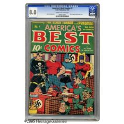 <B>America's Best Comics #7 (Nedor Publications, 1943) CGC VF 8.0 Cream to off-white pages.</B></I> Alex Schomburg's covers were always great, we all agree on that. But when it comes to laughs, how can you top this one, with Hitler, Mussolini, and Hirohito being exposed as the cowards they are? That's the Black Terror, Doc Strange, American Eagle, and Pyroman about to bring the pain to those despots, and no, <I>Il Duce</B></I>, hiding under that desk won't help you. This is the highest-graded copy of the issue, and in fact the only one graded above 6.5, that CGC has certified to date. Overstreet 2004 VF 8.0 value = $600. CGC census 12/04: 1 in 8.0, none higher.